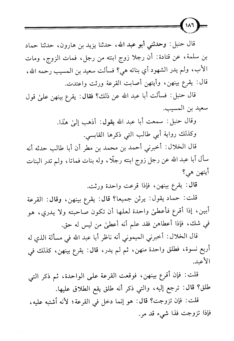 قال حنبل: وحدثني أبو عبد اللَّه، حدثنا يزيد بن هارون، حدثنا حماد بن سلمة، عن قتادة: أن رجلا زوج ابنته من رجل، فمات الزوج، ومات الأب، ولم يدر الشهود أي بناته هي؟ فسألت سعيد بن المسيب رحمه اللَّه، قال: يقرع بينهن، وأيتهن أصابت القرعة ورثت واعتدت.