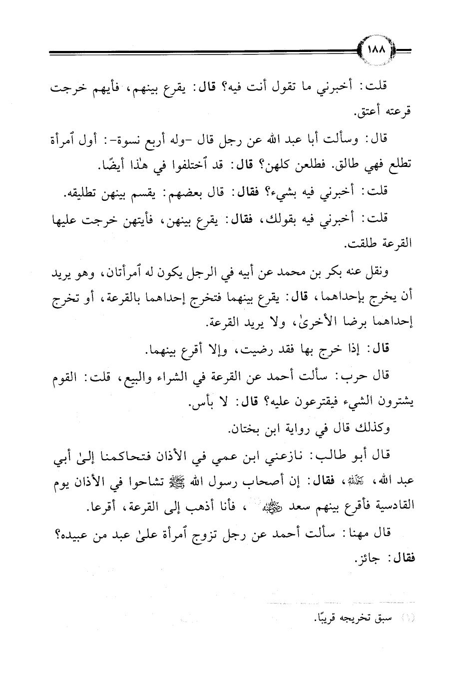 ونقل عنه بكر بن محمد عن أبيه في الرجل يكون له امرأتان، وهو يريد أن يخرج بإحداهما، قال: يقرع بينهما فتخرج إحداهما بالقرعة، أو تخرج إحداهما برضا الأخرى، ولا يريد القرعة.