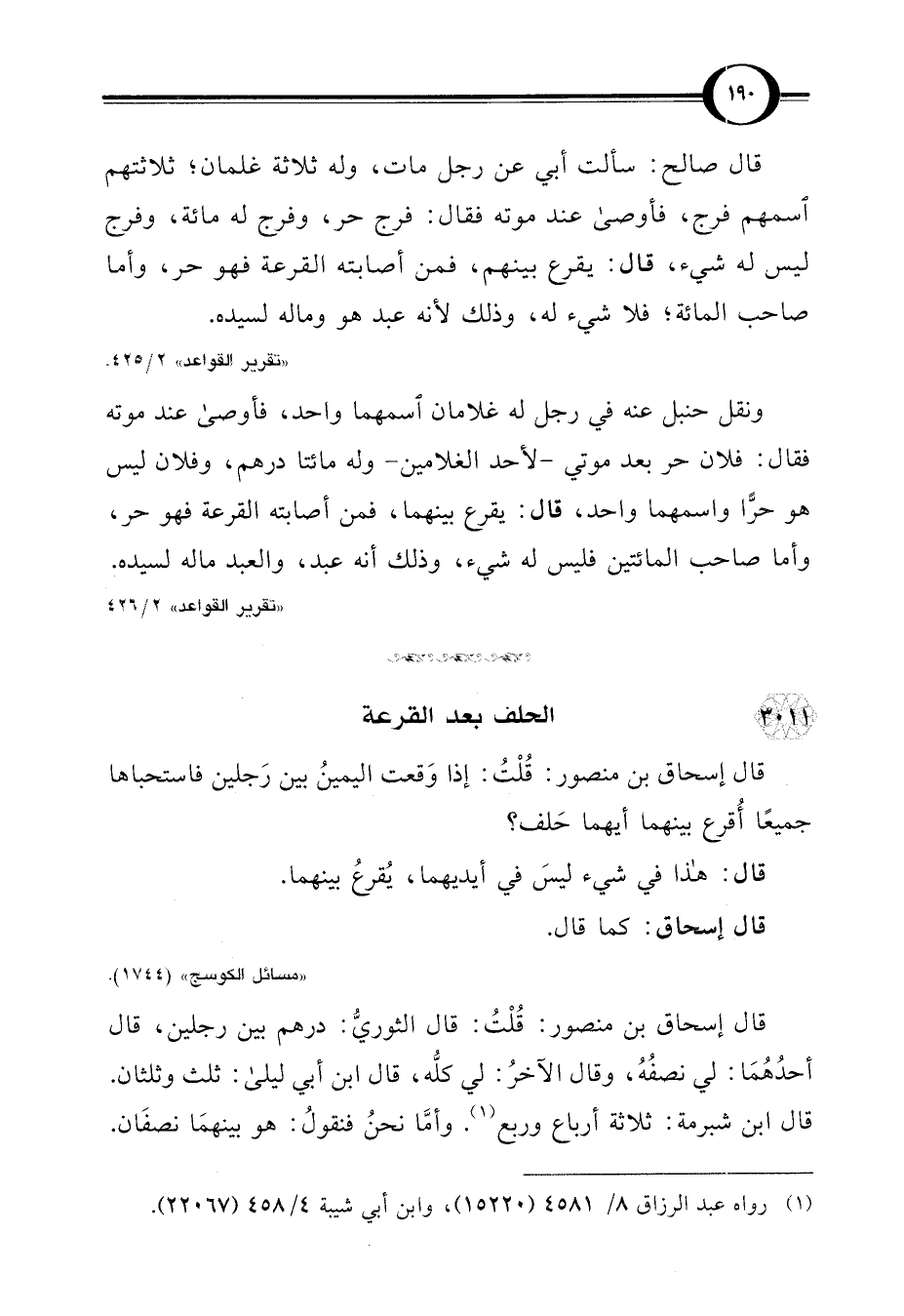 قال إسحاق بن منصور: قُلْتُ: قال الثوريُّ: درهم بين رجلين، قال أحدُهُمَا: لي نصفُهُ، وقال الآخرُ: لي كلُّه، قال ابن أبي ليلى: ثلث وثلثان. قال ابن شبرمة: ثلاثة أرباع وربع (¬1). وأمَّا نحنُ فنقولُ: هو بينهمَا نصفَان.
