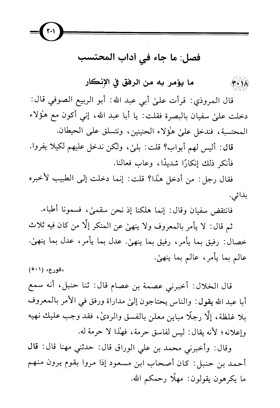 قال الخلال: أخبرني عصمة بن عصام قال: ثنا حنبل، أنه سمع أبا عبد اللَّه يقول: والناس يحتاجون إلى مداراة ورفق في الأمر بالمعروف بلا غلظة، إلَّا رجلًا مباين معلن بالفسق والردى، فقد وجب عليك نهيه وإعلانه، لأنه يقال: ليس لفاسق حرمة، فهذا لا حرمة له.