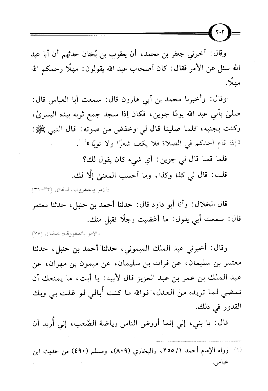 وقال: وأخبرنا محمد بن أبي هارون قال: سمعت أبا العباس قال: صلى بأبي عبد اللَّه يومًا جوين، فكان إذا سجد جمع ثوبه بيده اليسرى، وكنت بجنبه، فلما صلينا قال لي وخفض من صوته: قال النبي -صلى اللَّه عليه وسلم-: "إذا قام أحدكم في الصلاة فلا يكف شعرًا ولا ثوبًا" (¬1).