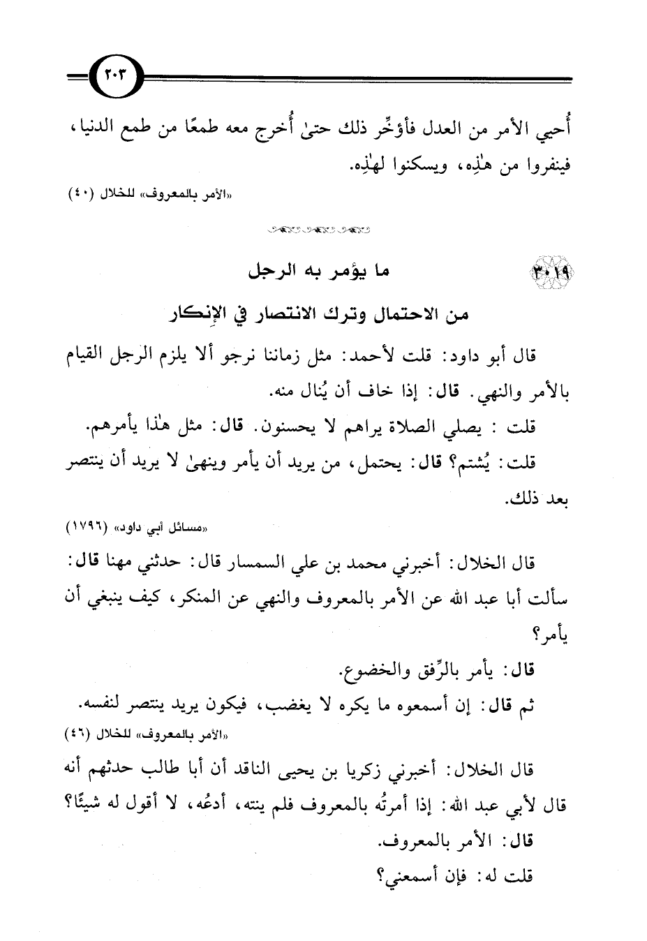 قال الخلال: أخبرني محمد بن علي السمسار قال: حدثني مهنا قال: سألت أبا عبد اللَّه عن الأمر بالمعروف والنهي عن المنكر، كيف ينبغي أن يأمر؟