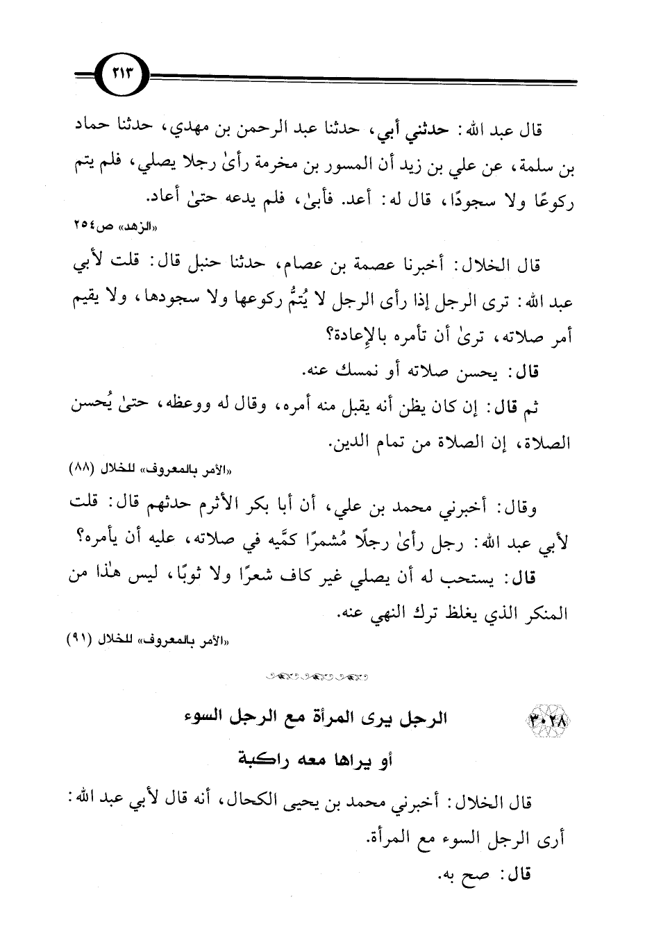 قال الخلال: أخبرنا عصمة بن عصام، حدثنا حنبل قال: قلت لأبي عبد اللَّه: ترى الرجل إذا رأى الرجل لا يُتمُّ ركوعها ولا سجودها، ولا يقيم أمر صلاته، ترى أن تأمره بالإِعادة؟