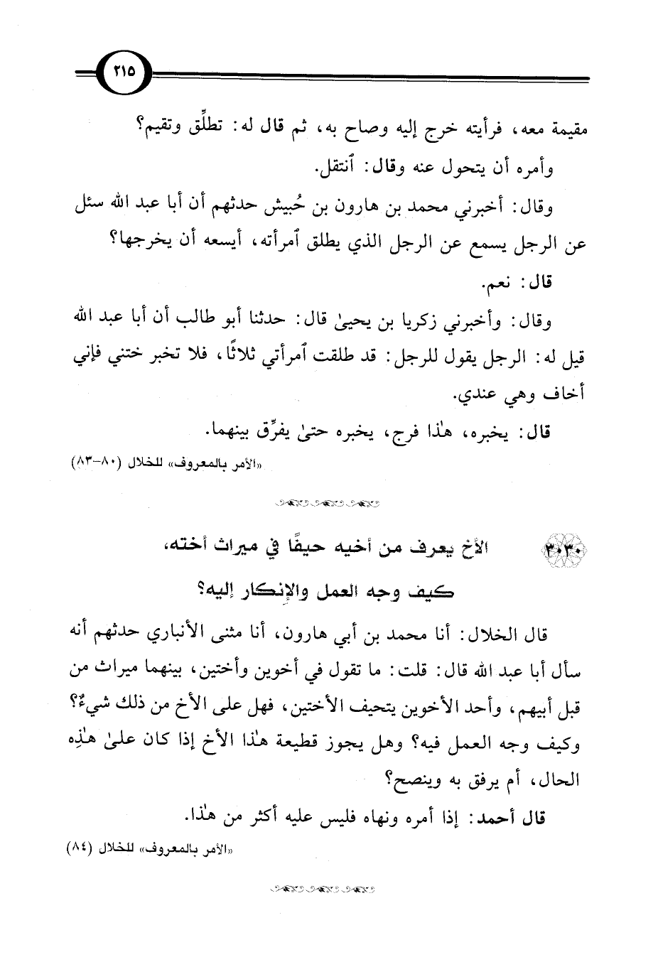 قال الخلال: أنا محمد بن أبي هارون، أنا مثنى الأنباري حدثهم أنه سأل أبا عبد اللَّه قال: قلت: ما تقول في أخوين وأختين، بينهما ميراث من قبل أبيهم، وأحد الأخوين يتحيف الأختين، فهل على الأخ من ذلك شيءٌ؟ وكيف وجه العمل فيه؟ وهل يجوز قطيعة هذا الأخ إذا كان على هذِه الحال، أم يرفق به وينصح؟