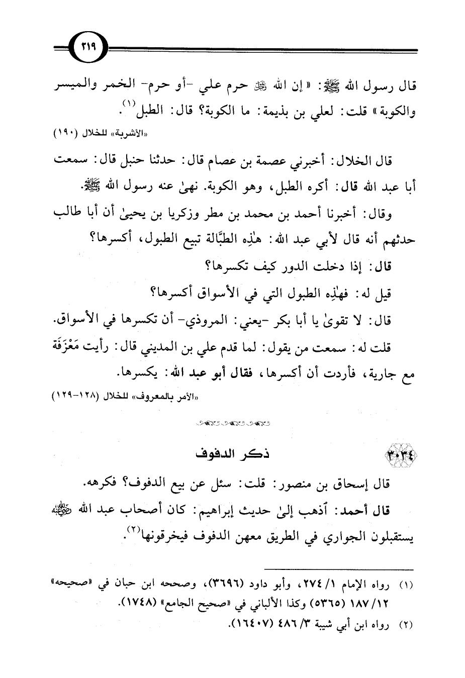 قال الخلال: أخبرني عصمة بن عصام قال: حدثنا حنبل قال: سمعت أبا عبد اللَّه قال: أكره الطبل، وهو الكوبة. نهى عنه رسول اللَّه -صلى اللَّه عليه وسلم-.