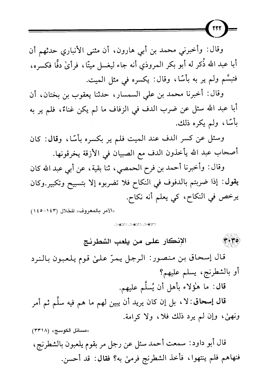 قال إسحاق بن منصور: الرجل يمرّ على قوم يلعبون بالنرد أو بالشطرنج، يسلم عليهم؟
