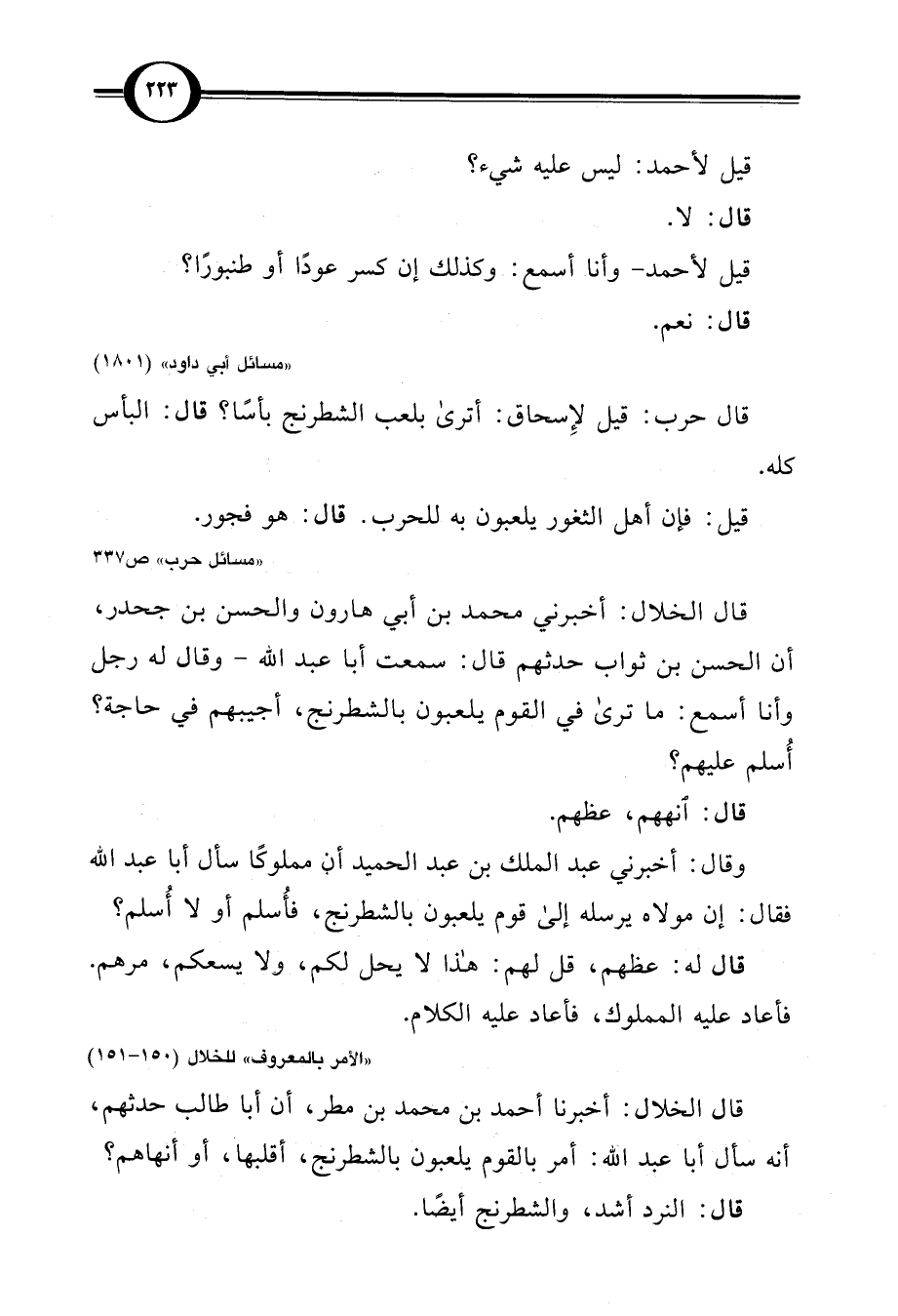 قال الخلال: أخبرني محمد بن أبي هارون والحسن بن جحدر، أن الحسن بن ثواب حدثهم قال: سمعت أبا عبد اللَّه -وقال له رجل وأنا أسمع: ما ترى في القوم يلعبون بالشطرنج، أجيبهم في حاجة؟ أُسلم عليهم؟