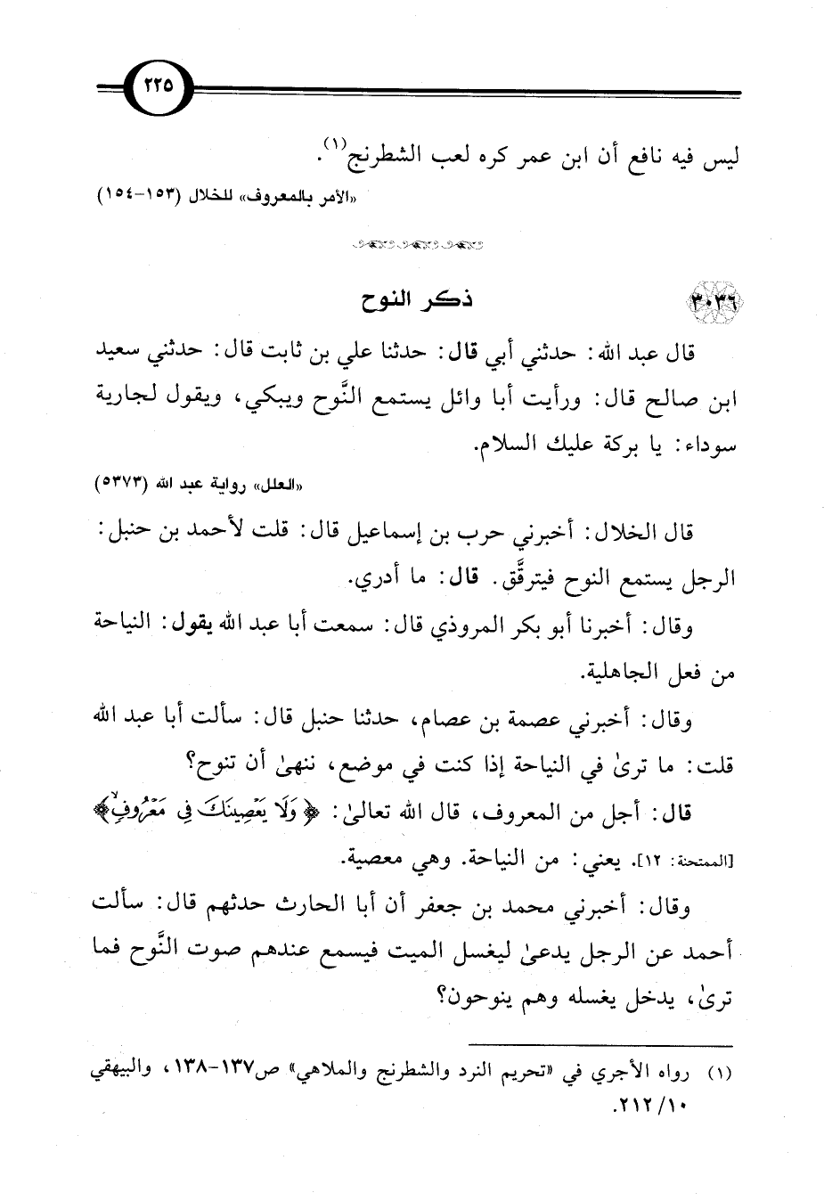 وقال: أخبرني عصمة بن عصام، حدثنا حنبل قال: سألت أبا عبد اللَّه قلت: ما ترى في النياحة إذا كنت في موضع، ننهى أن تنوح؟