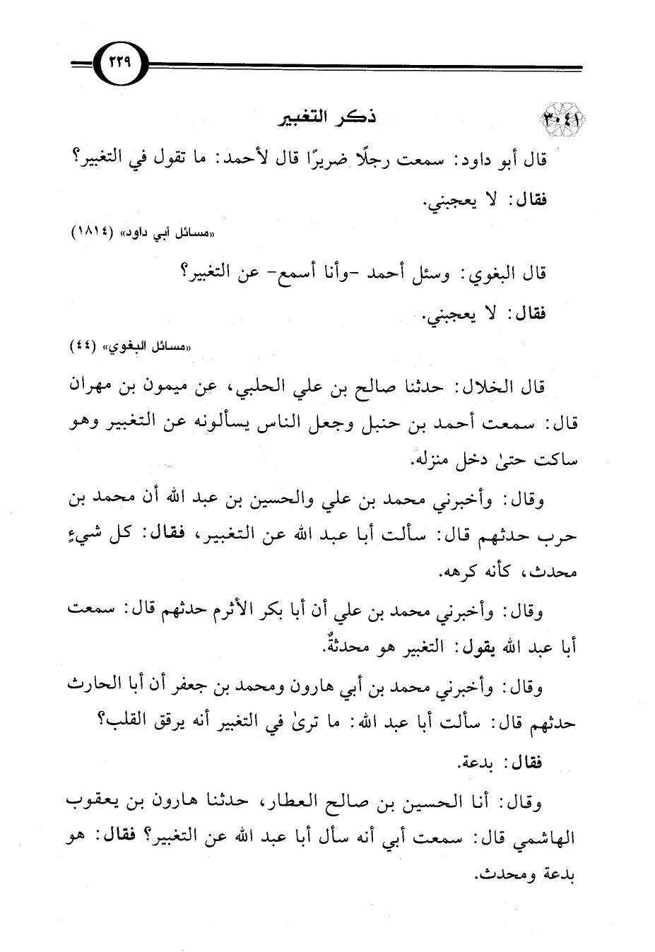 وقال: وأخبرني محمد بن علي والحسين بن عبد اللَّه أن محمد بن حرب حدثهم قال: سألت أبا عبد اللَّه عن التغبير، فقال: كل شيءٍ محدث، كأنه كرهه.