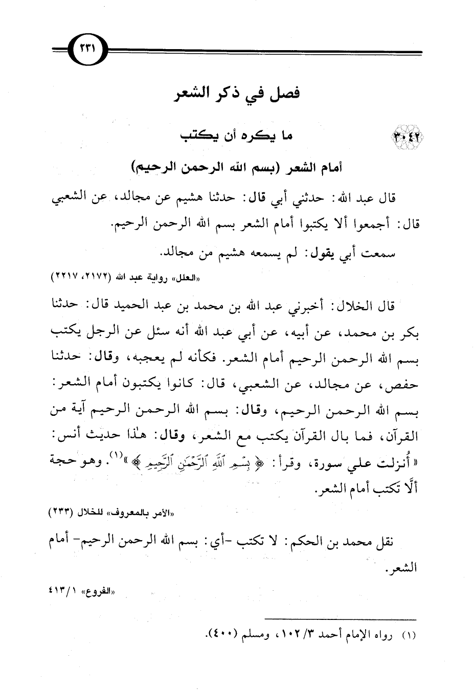 قال عبد اللَّه: حدثني أبي قال: حدثنا هشيم عن مجالد، عن الشعبي قال: أجمعوا ألا يكتبوا أمام الشعر بسم اللَّه الرحمن الرحيم.