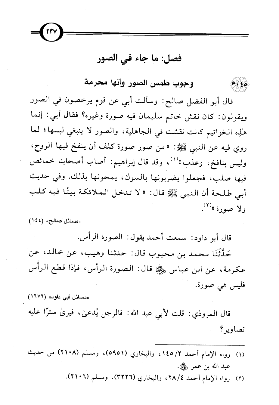 قال أبو الفضل صالح: وسألت أبي عن قوم يرخصون في الصور ويقولون: كان نقش خاتم سليمان فيه صورة وغيره؟ فقال أبي: إنما هذِه الخواتيم كانت نقشت في الجاهلية، والصور لا ينبغي لبسها؛ لما روي فيه عن النبي -صلى اللَّه عليه وسلم-: "من صور صورة كلف أن ينفخ فيها الروح، وليس بنافخ، وعذب" (¬1)، وقد قال إبراهيم: أصاب أصحابنا خمائص فيها صلب، فجعلوا يضربونها بالسوك، يمحونها بذلك. وفي حديث أبي طلحة أن النبي -صلى اللَّه عليه وسلم- قال: "لا تدخل الملائكة بيتًا فيه كلب ولا صورة" (¬2).