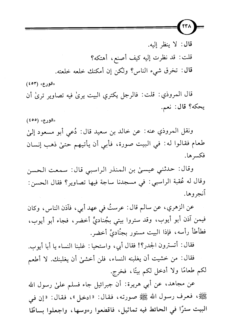 ونقل المروذي عنه: عن خالد بن سعيد قال: دُعي أبو مسعود إلى طعام فقالوا له: في البيت صورة، فأبي أن يأتيهم حتى ذهب إنسان فكسرها.