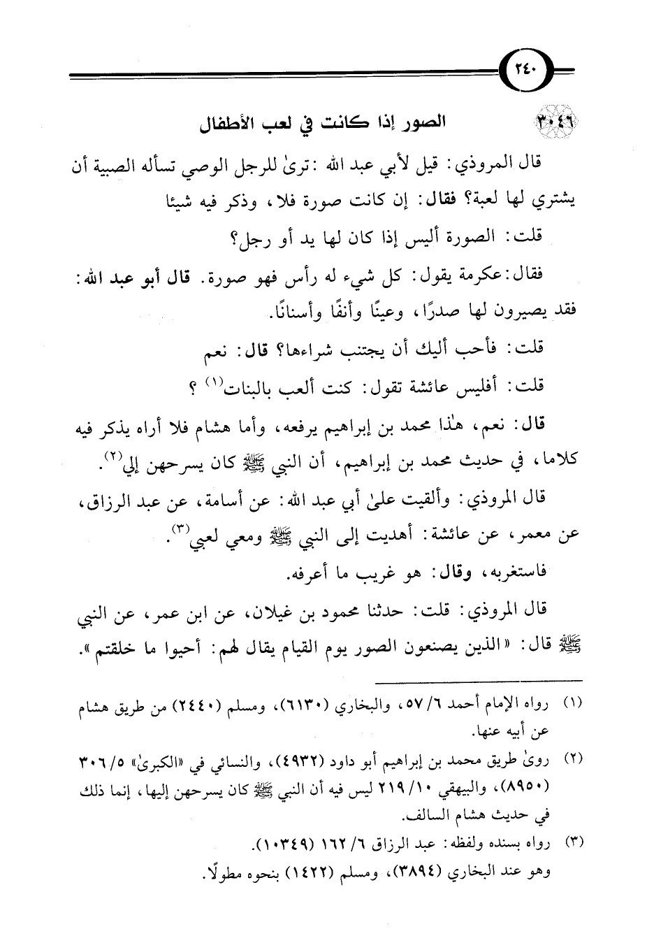 قال المروذي: قلت: حدثنا محمود بن غيلان، عن ابن عمر، عن النبي -صلى اللَّه عليه وسلم- قال: "الذين يصنعون الصور يوم القيام يقال لهم: أحيوا ما خلقتم".