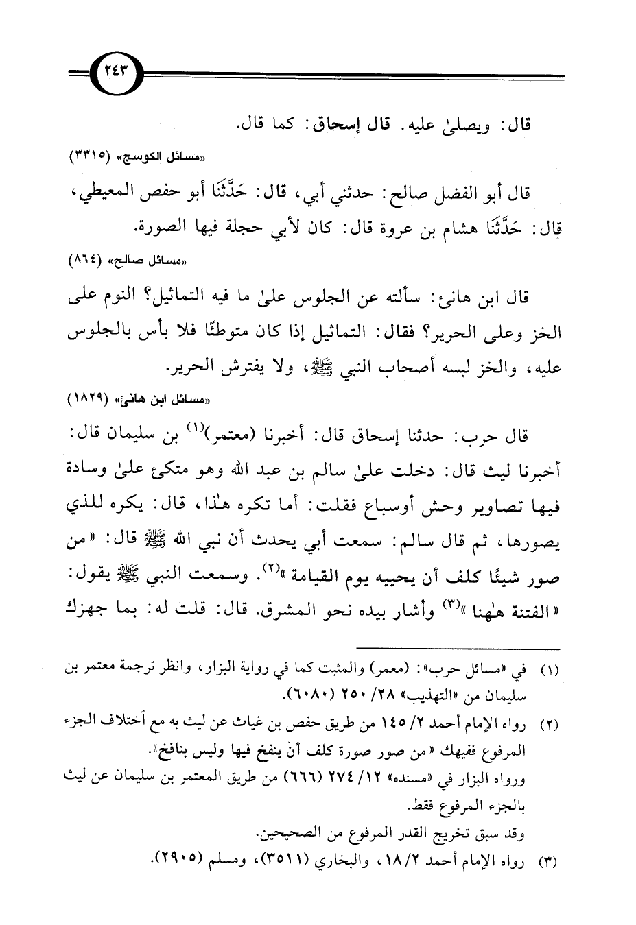 قال حرب: حدثنا إسحاق قال: أخبرنا (معتمر) (¬1) بن سليمان قال: أخبرنا ليث قال: دخلت على سالم بن عبد اللَّه وهو متكئ على وسادة فيها تصاوير وحش أو سباع فقلت: أما تكره هذا، قال: يكره للذي يصورها، ثم قال سالم: سمعت أبي يحدث أن نبي اللَّه -صلى اللَّه عليه وسلم- قال: "من صور شيئًا كلف أن يحييه يوم القيامة" (¬2). وسمعت النبي -صلى اللَّه عليه وسلم- يقول: "الفتنة ههنا" (¬3) وأشار بيده نحو المشرق. قال: قلت له: بما جهزك