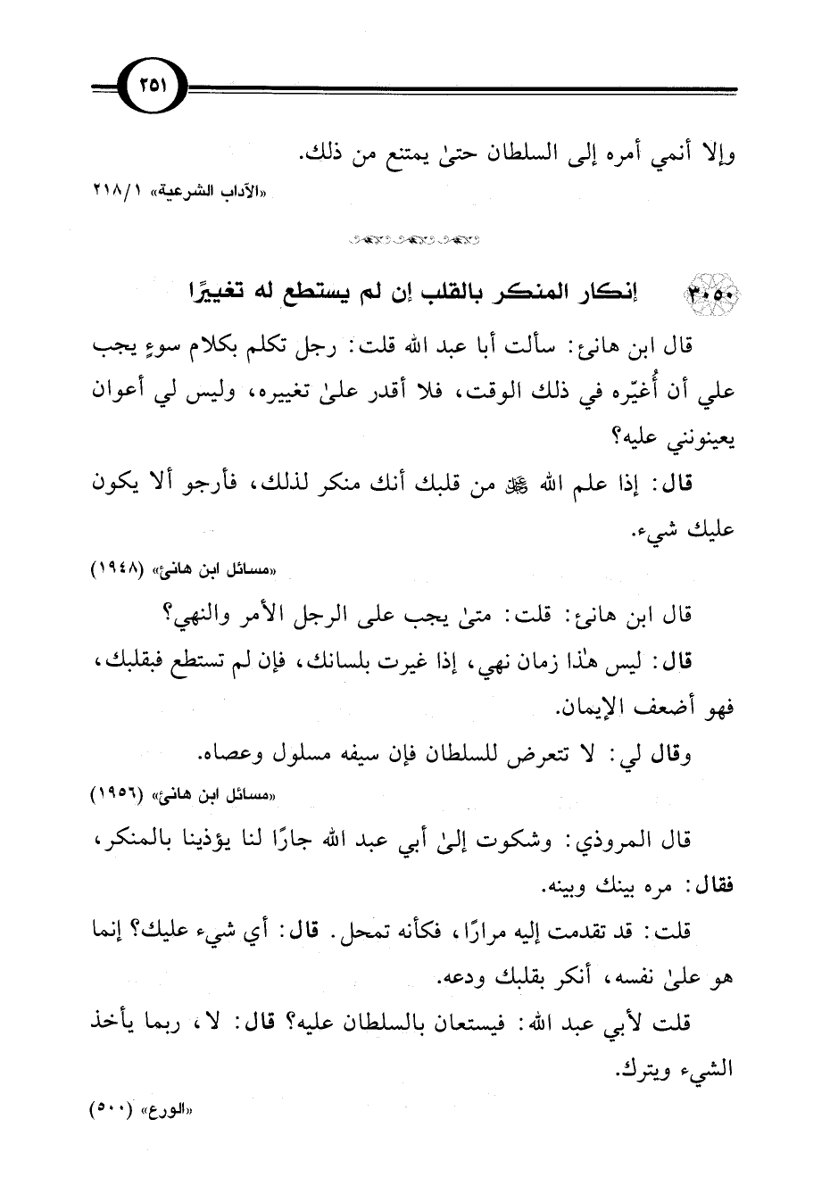 قال ابن هانئ: سألت أبا عبد اللَّه قلت: رجل تكلم بكلام سوءٍ يجب عليّ أن أُغيّره في ذلك الوقت، فلا أقدر على تغييره، وليس لي أعوان يعينونني عليه؟