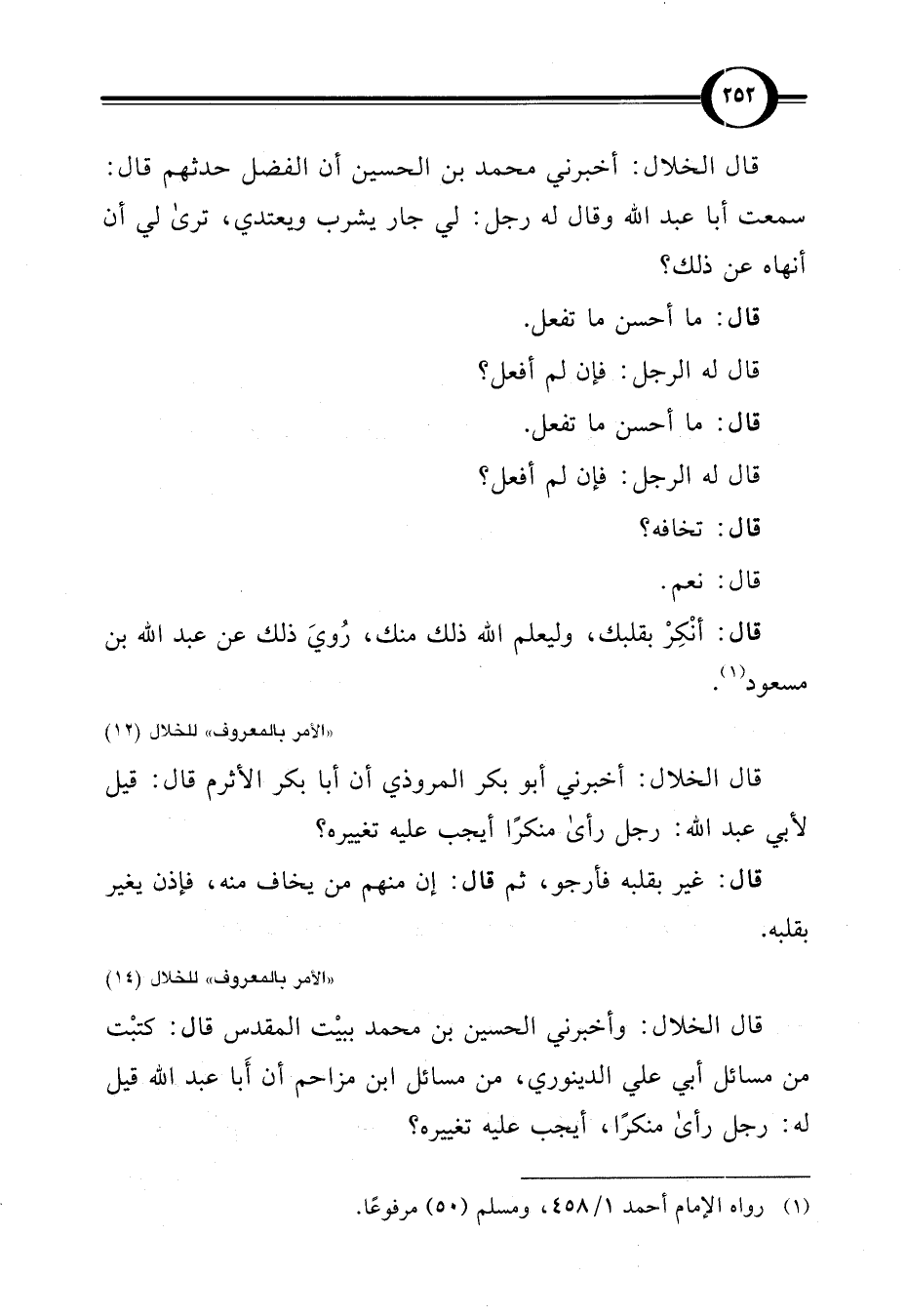 قال الخلال: وأخبرني الحسين بن محمد ببيْت المقدس قال: كتبْت من مسائل أبي علي الدينوري، من مسائل ابن مزاحم أن أَبا عبد اللَّه قيل له: رجل رأى منكرًا، أيجب عليه تغييره؟