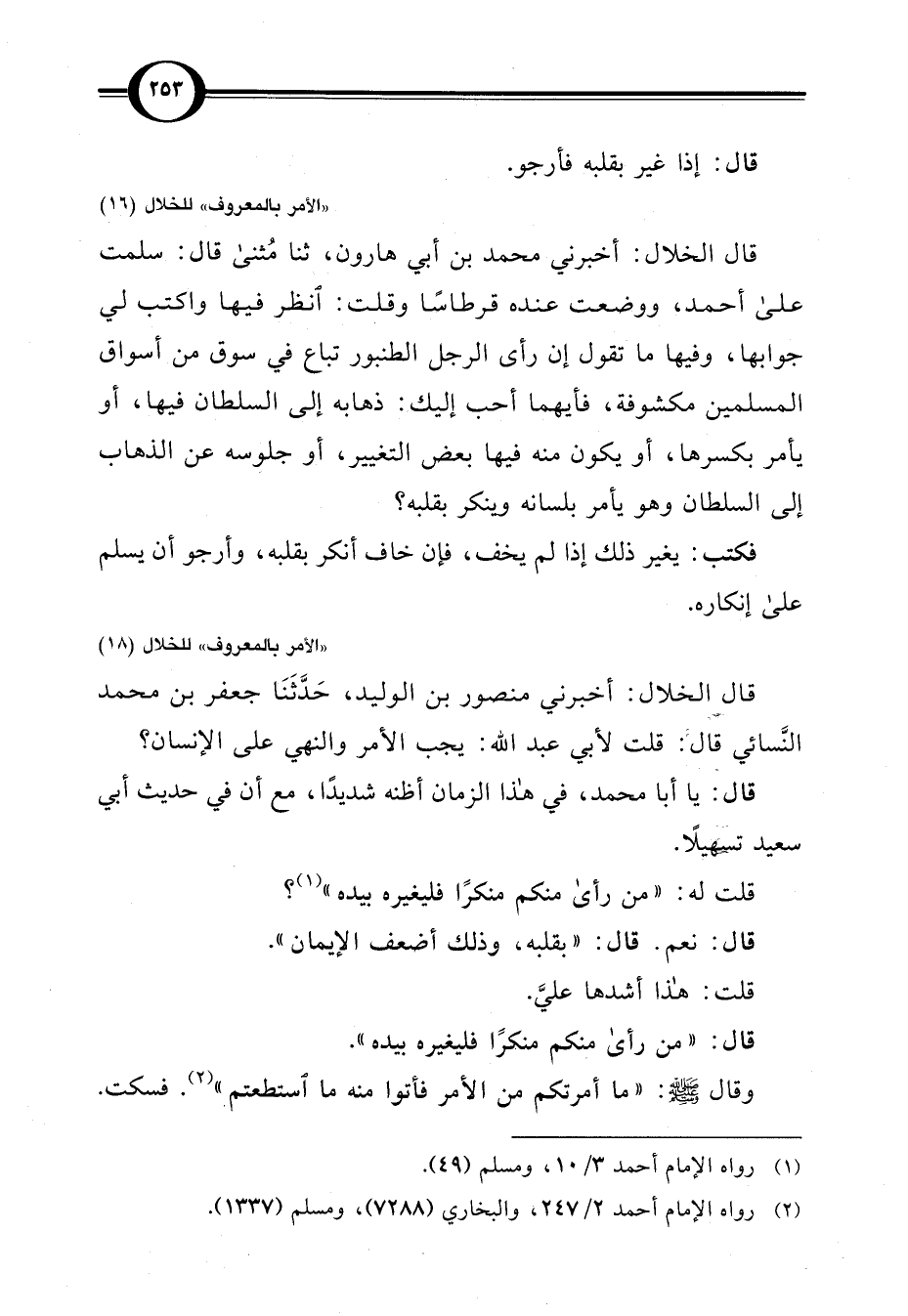 قال الخلال: أخبرني منصور بن الوليد، حَدَّثَنَا جعفر بن محمد النَّسائي قال: قلت لأبي عبد اللَّه: يجب الأمر والنهي على الإنسان؟