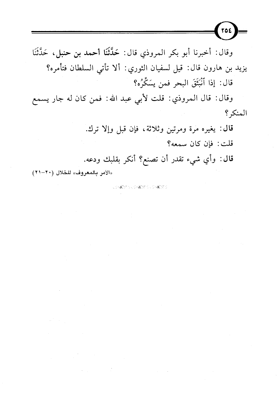 وقال: أخبرنا أبو بكر المروذي قال: حَدَّثنَا أحمد بن حنبل، حَدَّثَنَا يزيد بن هارون قال: قيل لسفيان الثوري: ألا تأتي السلطان فتأمره؟
