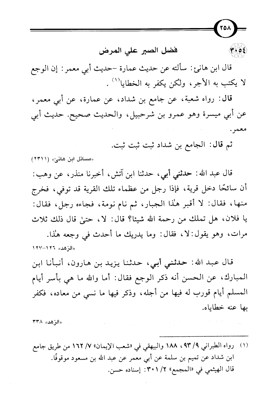 قال ابن هانئ: سألته عن حديث عمارة -حديث أبي معمر: إن الوجع لا يكتب به الأجر، ولكن يكفر به الخطايا (¬1).