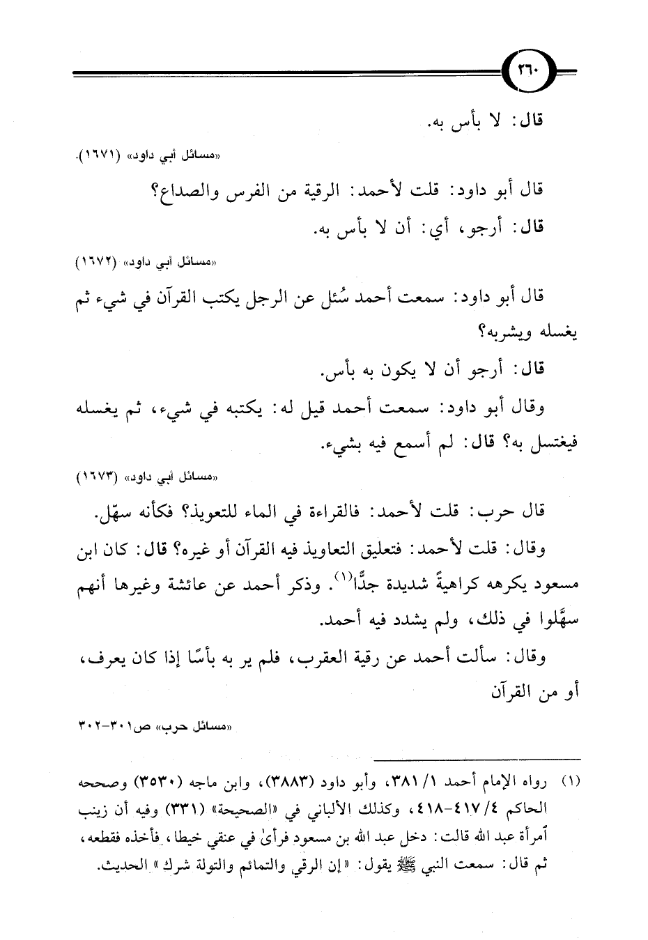 قال أبو داود: سمعت أحمد سُئل عن الرجل يكتب القرآن في شيء ثم يغسله ويشربه؟