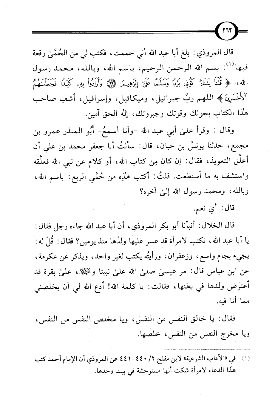 (¬1) في "الآداب الشرعية" لابن مفلح 2/ 440 - 441 عن المروذي أن الإمام أحمد كتب هذا الدعاء لامرأة شكت أنها مستوحشة في بيت وحدها.