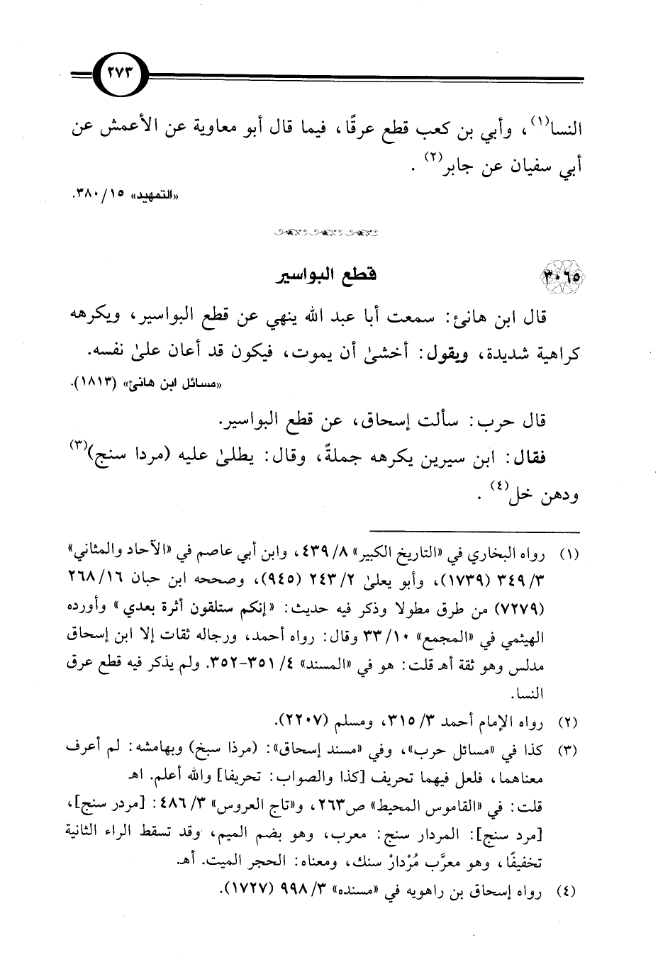 قال ابن هانئ: سمعت أبا عبد اللَّه ينهي عن قطع البواسير، ويكرهه كراهية شديدة، ويقول: أخشى أن يموت، فيكون قد أعان على نفسه.