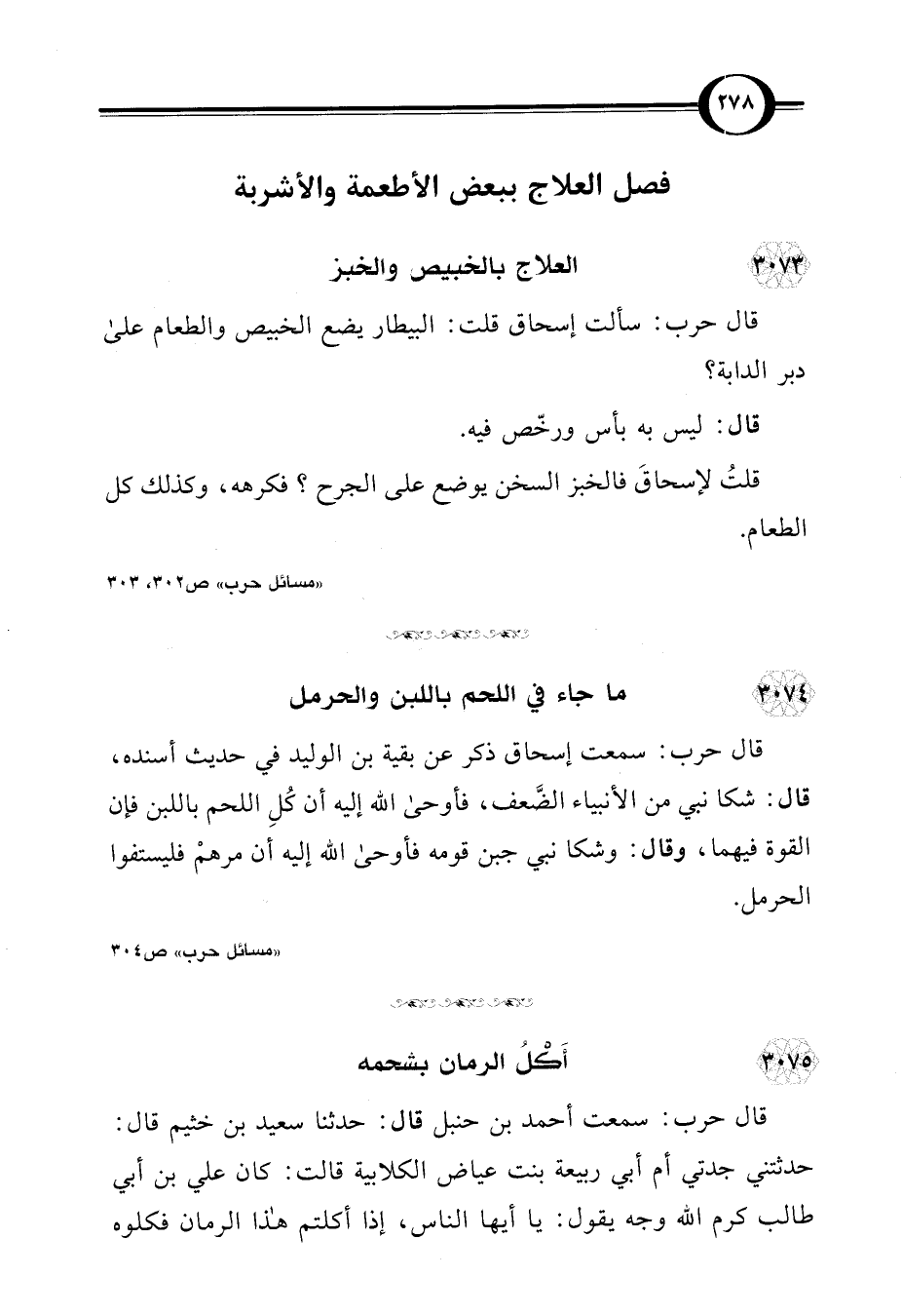 قلتُ لإسحاقَ فالخبز السخن يوضع على الجرح؟ فكرهه، وكذلك كل الطَّعام.
