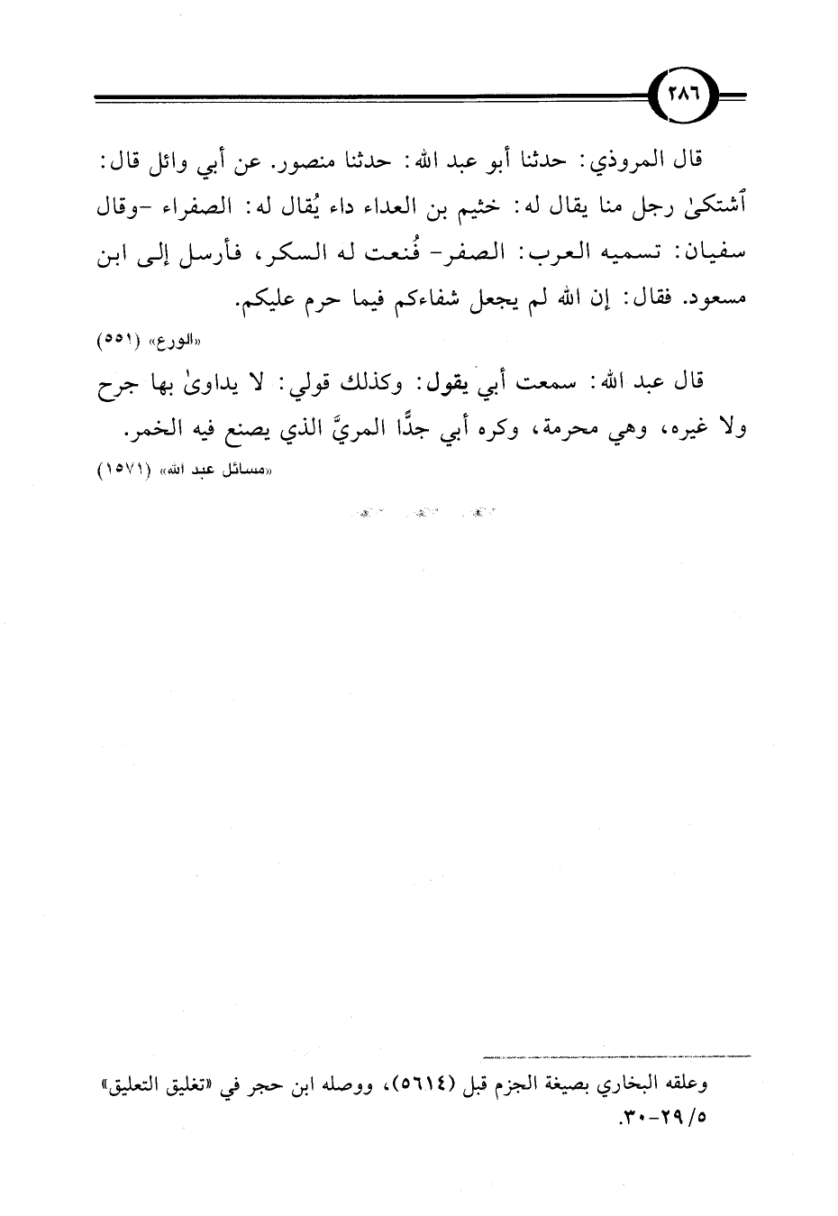 قال المروذي: حدثنا أبو عبد اللَّه: حدثنا منصور. عن أبي وائل قال: اشتكى رجل منا يقال له: خثيم بن العداء داء يُقال له: الصفراء -وقال سفيان: تسميه العرب: الصفر- فُنعت له السكر، فأرسل إلى ابن مسعود. فقال: إن اللَّه لم يجعل شفاءكم فيما حرم عليكم.