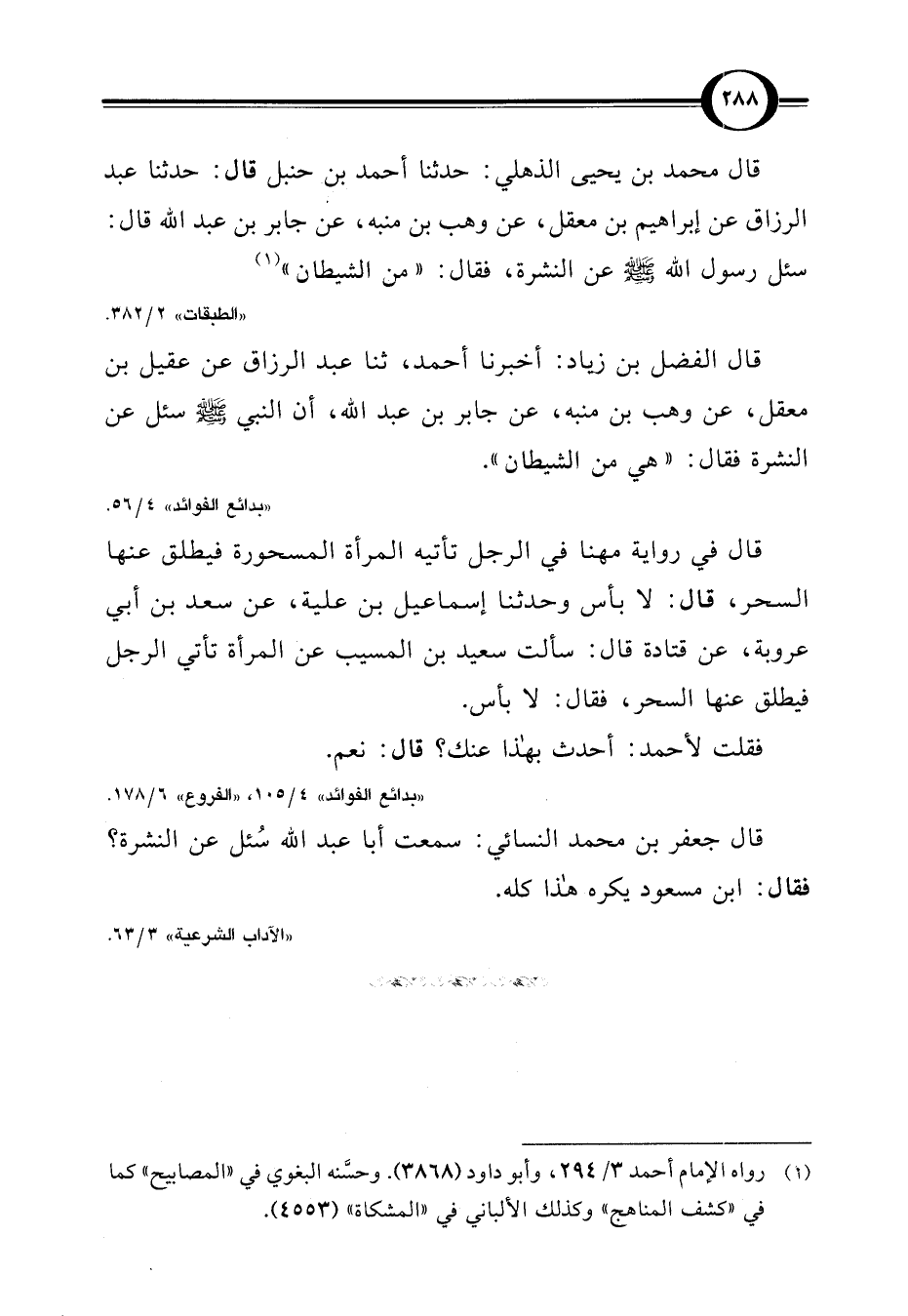 قال محمد بن يحيى الذهلي: حدثنا أحمد بن حنبل قال: حدثنا عبد الرزاق عن إبراهيم بن معقل، عن وهب بن منبه، عن جابر بن عبد اللَّه قال: سئل رسول اللَّه -صلى اللَّه عليه وسلم- عن النشرة، فقال: "من الشيطان" (¬1)
