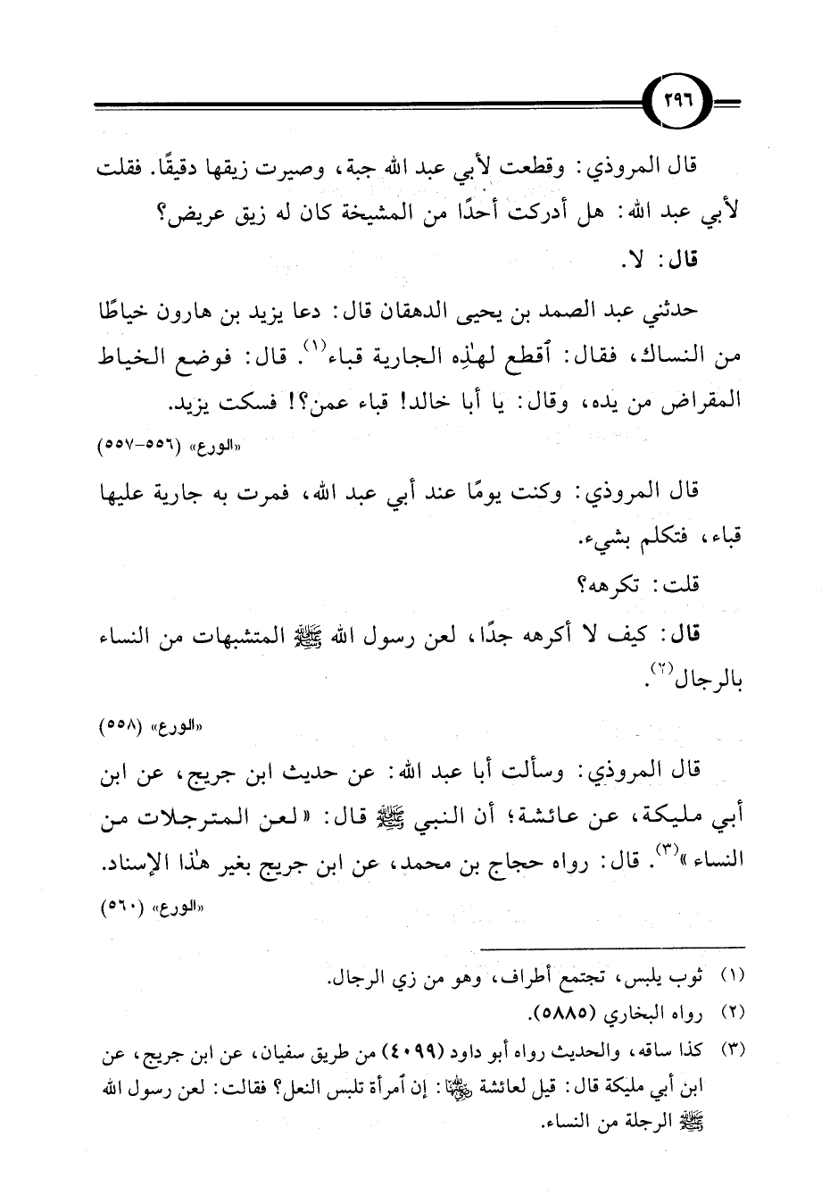 قال المروذي: وسألت أبا عبد اللَّه: عن حديث ابن جريج، عن ابن أبي مليكة، عن عائشة؛ أن النبي -صلى اللَّه عليه وسلم- قال: "لعن المترجلات من النساء" (¬3). قال: رواه حجاج بن محمد، عن ابن جريج بغير هذا الإسناد.