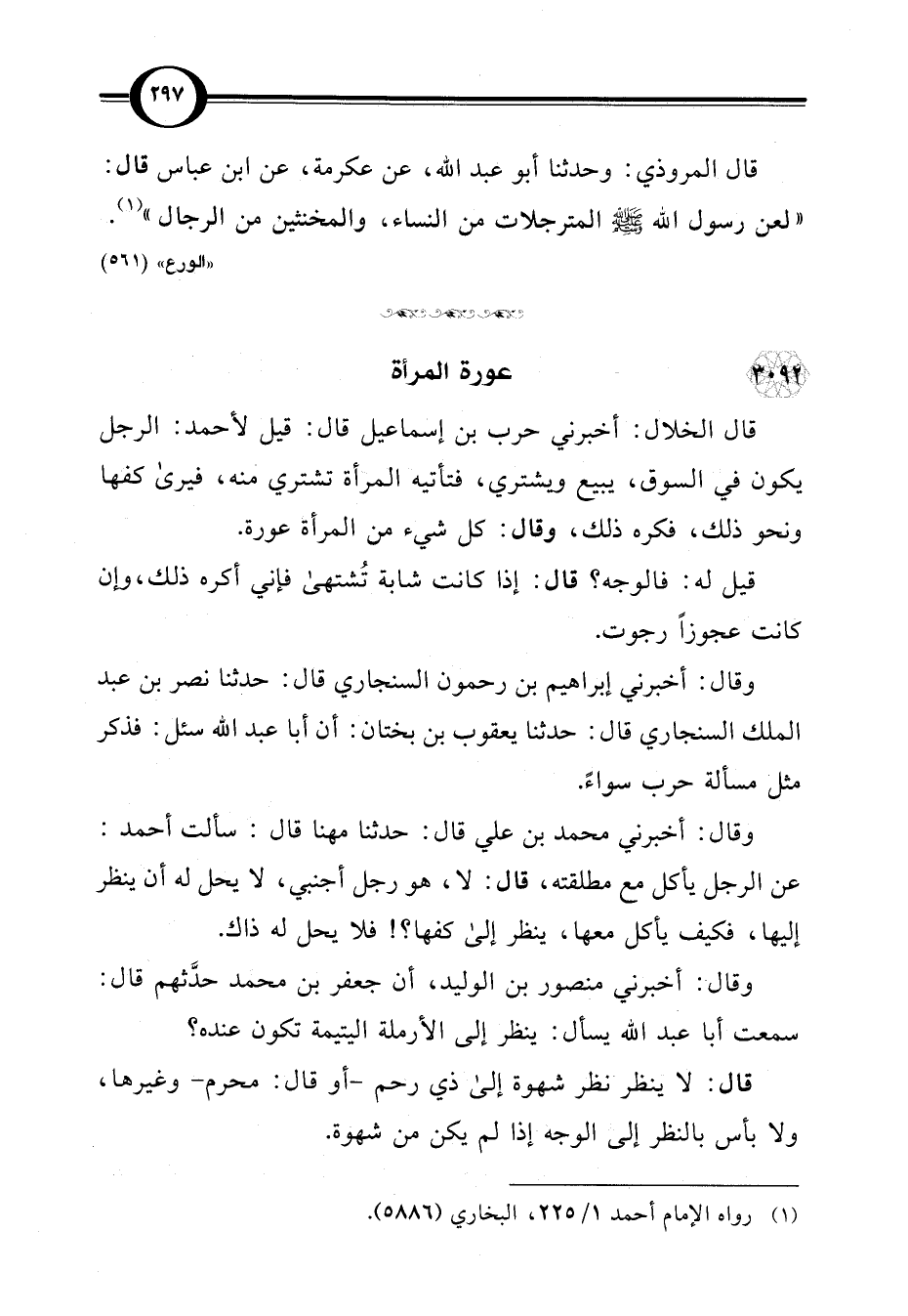 قال المروذي: وحدثنا أبو عبد اللَّه، عن عكرمة، عن ابن عباس قال: "لعن رسول اللَّه -صلى اللَّه عليه وسلم- المترجلات من النساء، والمخنثين من الرجال" (¬1).
