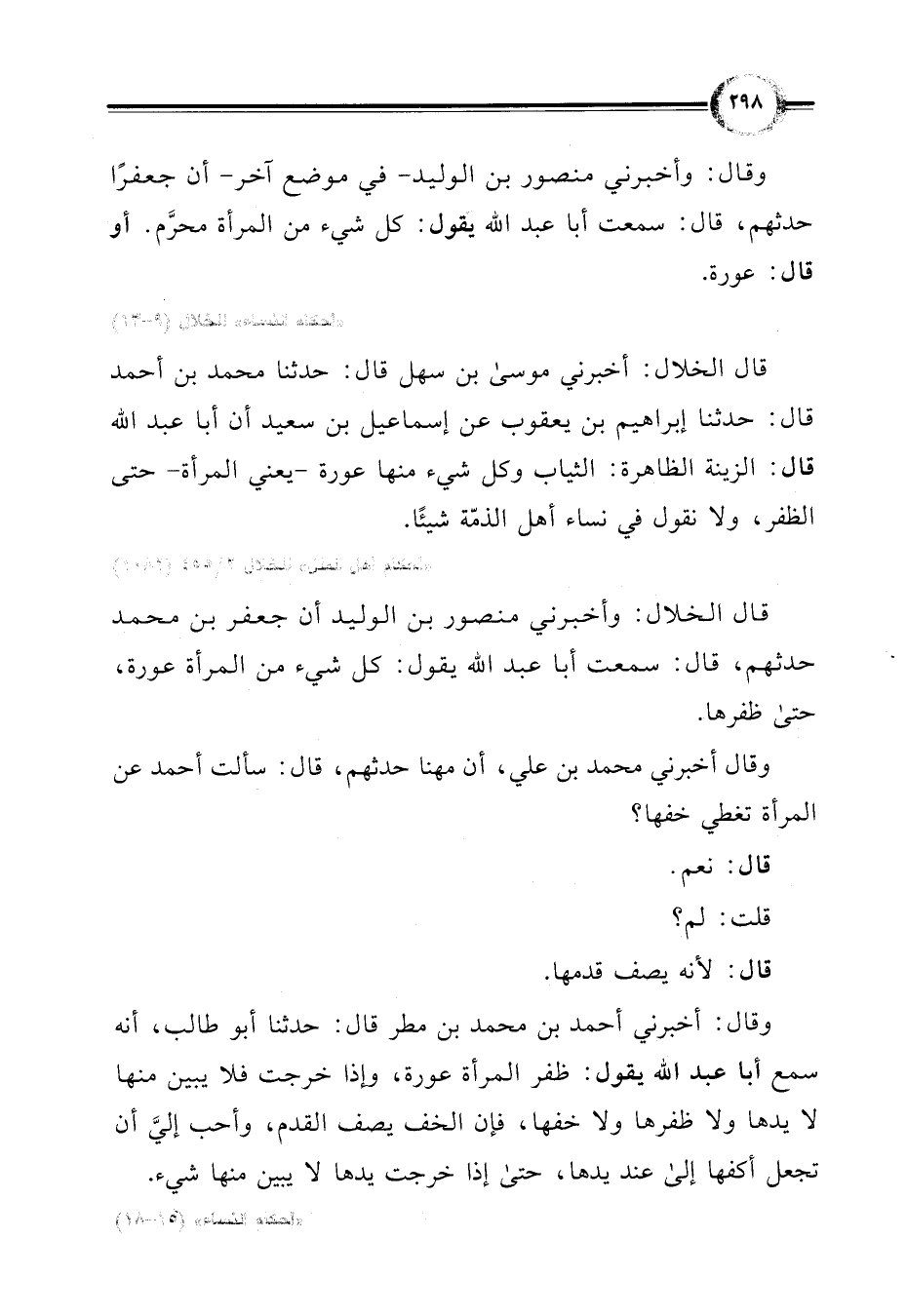 قال الخلال: وأخبرني منصور بن الوليد أن جعفر بن محمد حدثهم، قال: سمعت أبا عبد اللَّه يقول: كل شيء من المرأة عورة، حتى ظفرها.