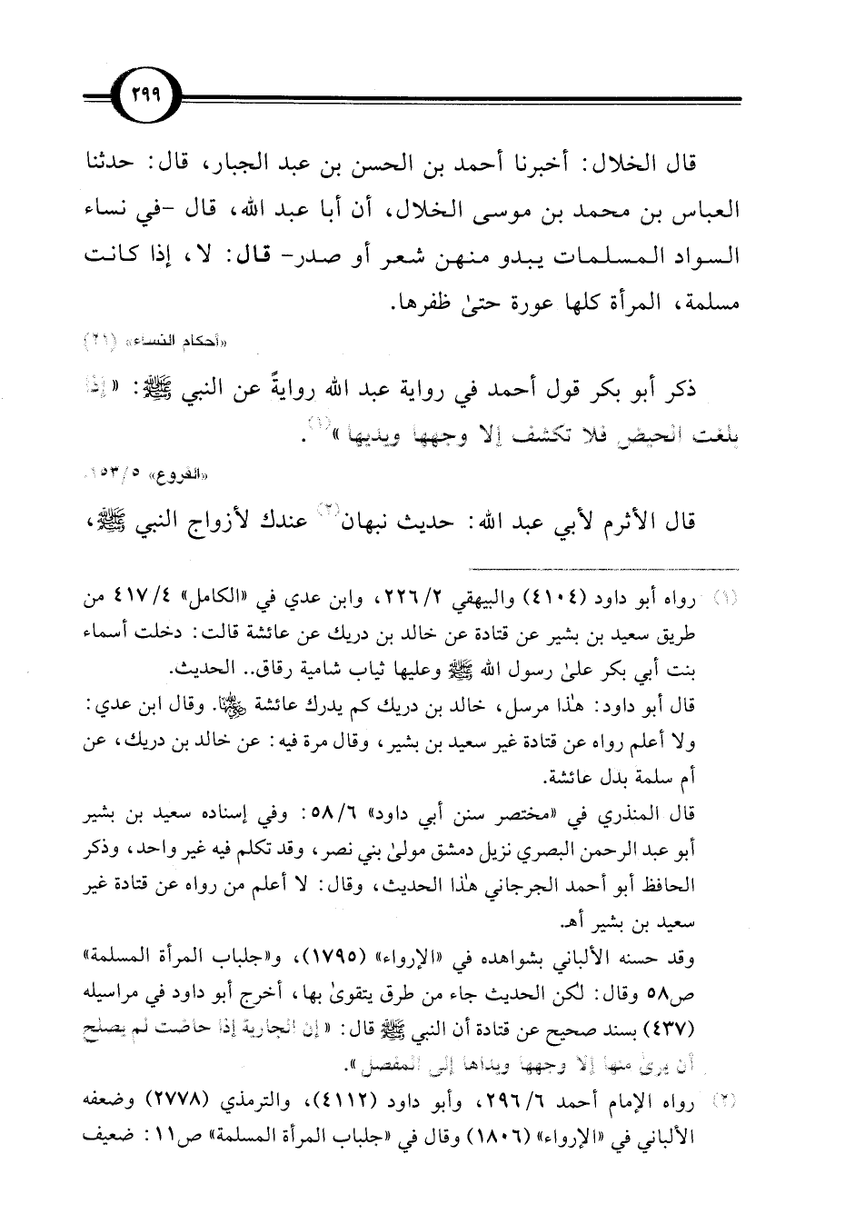 قال الخلال: أخبرنا أحمد بن الحسن بن عبد الجبار، قال: حدثنا العباس بن محمد بن موسى الخلال، أن أبا عبد اللَّه، قال -في نساء السواد المسلمات يبدو منهن شعر أو صدر- قال: لا، إذا كانت مسلمة، المرأة كلها عورة حتى ظفرها.