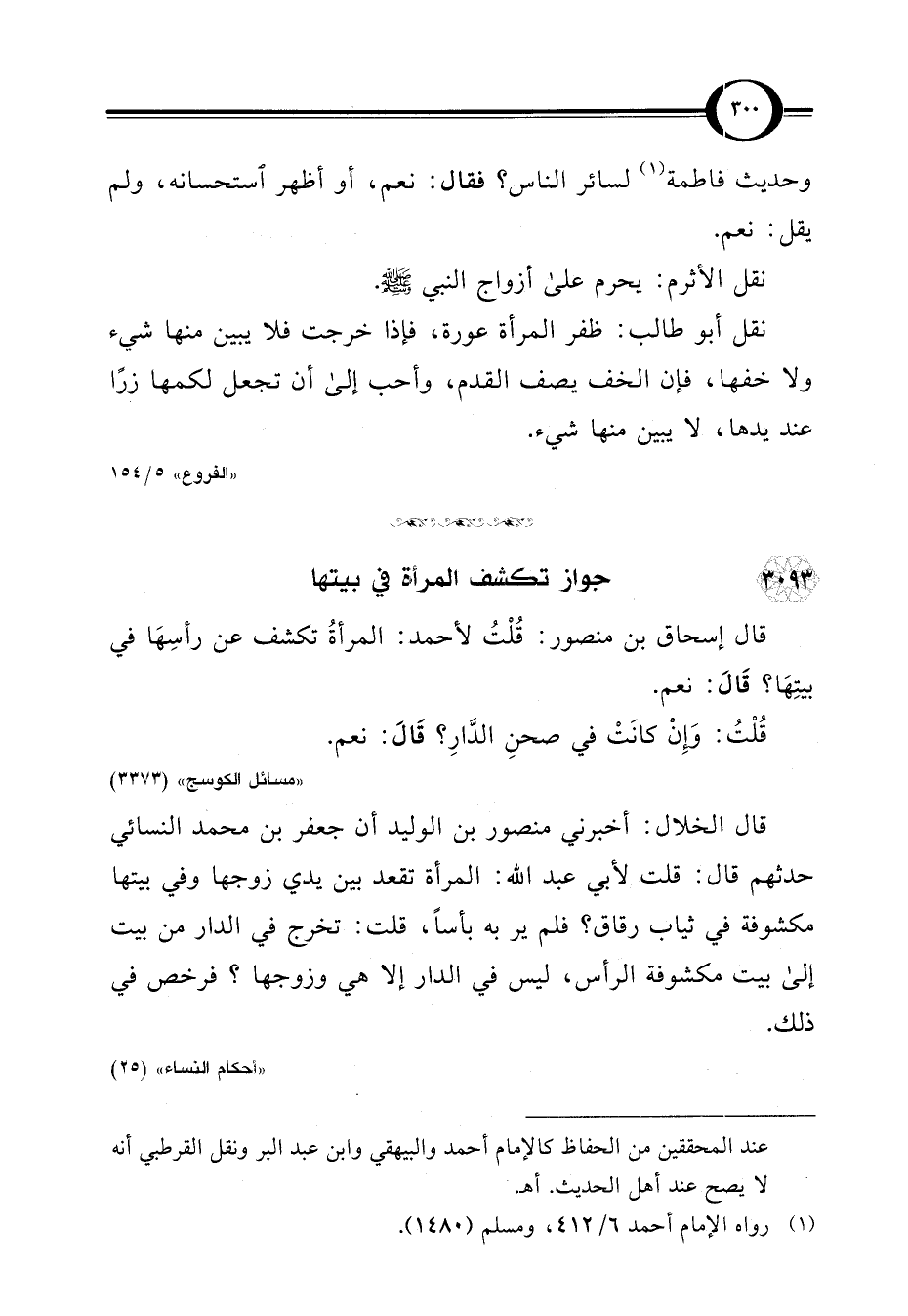 قال إسحاق بن منصور: قُلْتُ لأحمد: المرأةُ تكشف عن رأسِهَا في بيتِهَا؟ قَالَ: نعم.