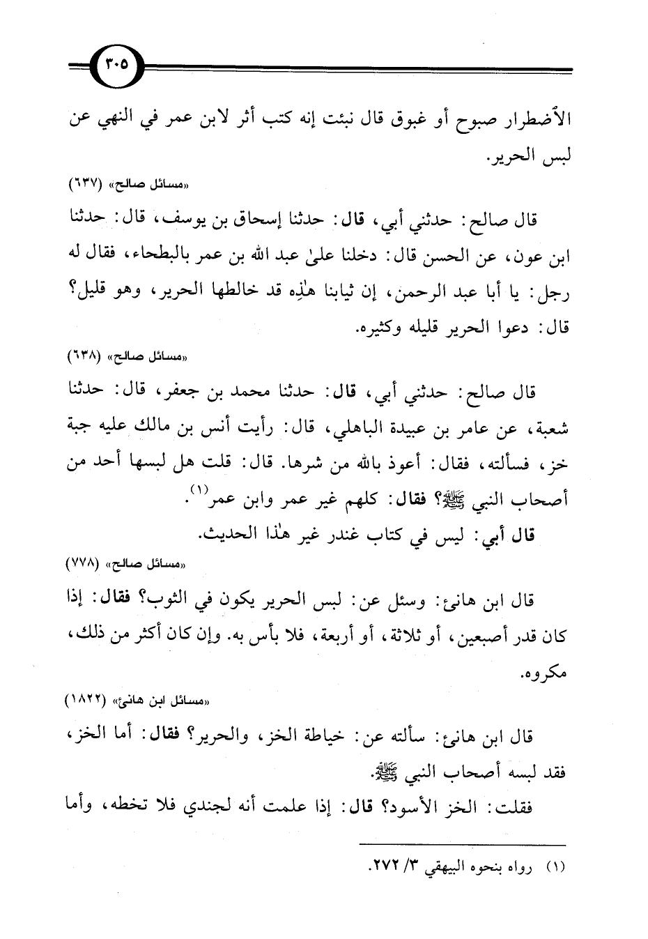 قال صالح: حدثني أبي، قال: حدثنا إسحاق بن يوسف، قال: حدثنا ابن عون، عن الحسن قال: دخلنا على عبد اللَّه بن عمر بالبطحاء، فقال له رجل: يا أبا عبد الرحمن، إن ثيابنا هذِه قد خالطها الحرير، وهو قليل؟ قال: دعوا الحرير قليله وكثيره.