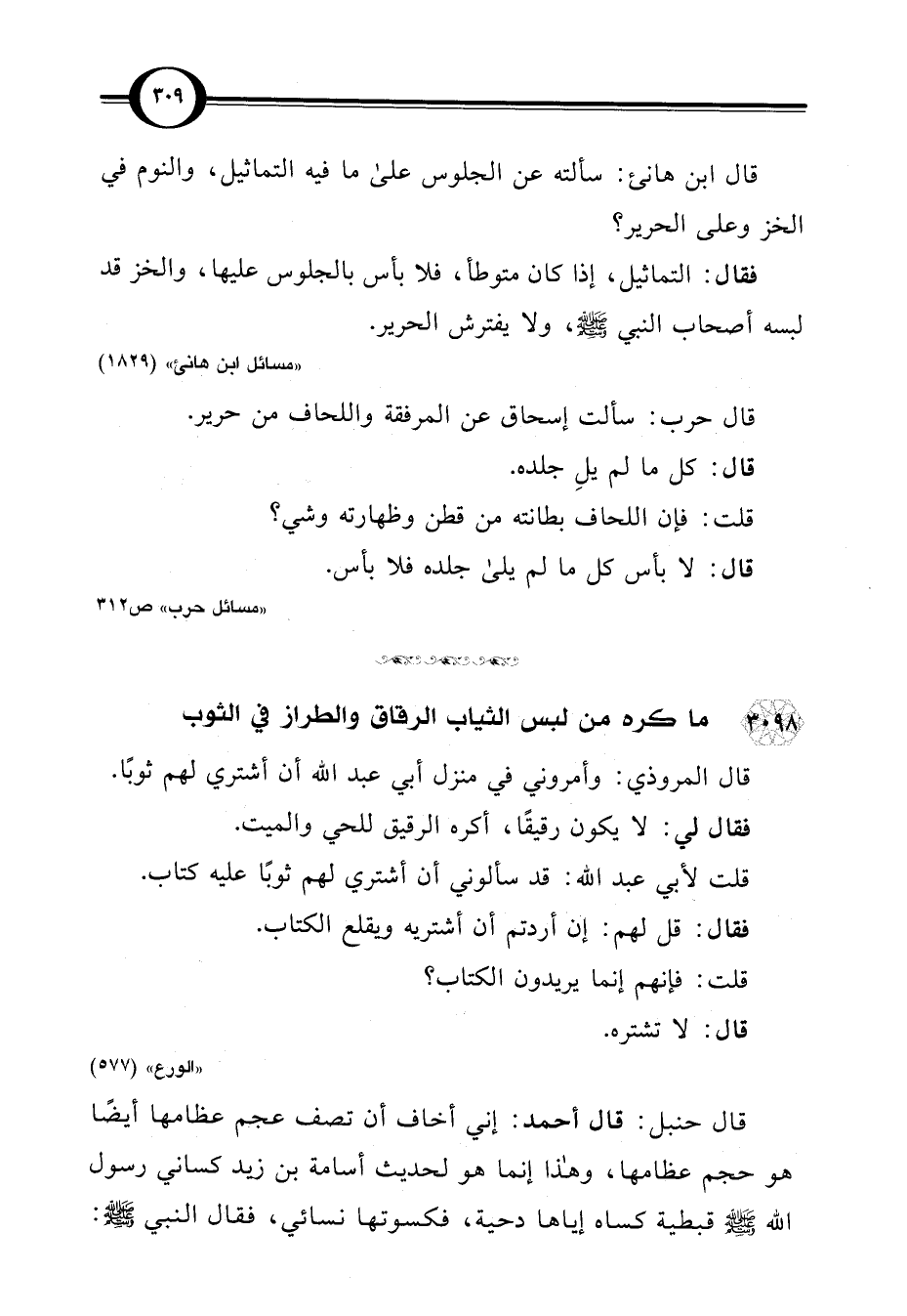 قال ابن هانئ: سألته عن الجلوس على ما فيه التماثيل، والنوم في الخز وعلى الحرير؟