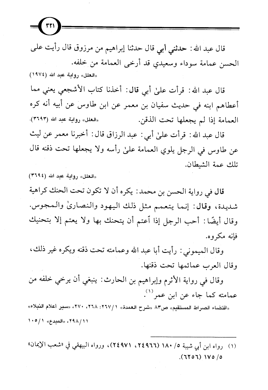 قال عبد اللَّه: قرأت على أبي: عبد الرزاق قال: أخبرنا معمر عن ليث عن طاوس في الرجل يلوي العمامة على رأسه ولا يجعلها تحت ذقنه قال تلك عمة الشيطان.