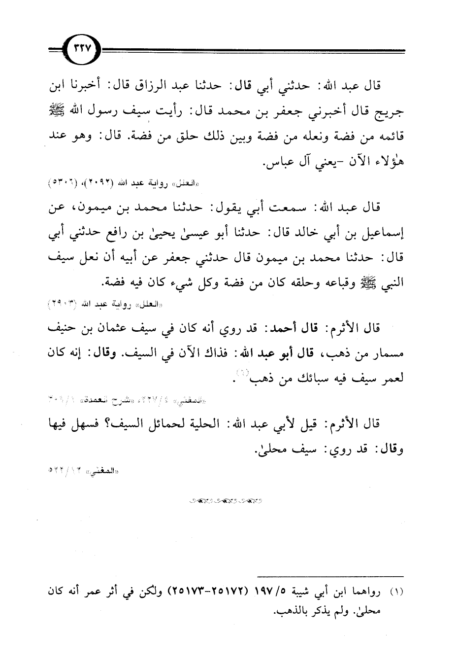 قال عبد اللَّه: حدثني أبي قال: حدثنا عبد الرزاق قال: أخبرنا ابن جريج قال أخبرني جعفر بن محمد قال: رأيت سيف رسول اللَّه -صلى اللَّه عليه وسلم- قائمه من فضة ونعله من فضة وبين ذلك حلق من فضة. قال: وهو عند هؤلاء الآن -يعني آل عباس.