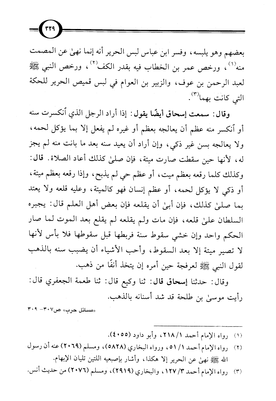 وقال: سمعت إسحاق أيضًا يقول: إذا أراد الرجل الذي انكسرت سنه أو انكسر منه عظم أن يعالجه بعظم أو غيره لم يفعل إلا بما يؤكل لحمه، ولا يعالجه بسن غير ذكي، وإن أراد أن يعيد سنه بعد ما بانت منه لم يجز له، لأنها حين سقطت صارت ميتة، فإن صلى كذلك أعاد الصلاة. قال: وكذلك كما رقعه بعظم ميت، أو عظم حي لم يذبح، وإذا رقعه بعظم ميتة، أو ذكي لا يؤكل لحمه، أو عظم إنسان فهو كالميتة، وعليه قلعه ولا يعتد بما صلى كذلك، فإن أبى أن يقلعه فإن بعض أهل العلم قال: يجبره السلطان على قلعه، فإن مات ولم يقلعه لم يقلع بعد الموت لما صار الحكم واحد وإن خشي سقوط سنة فربطها قبل سقوطها فلا بأس لأنها لا تصير ميتة إلا بعد السقوط، وأحب الأشياء أن يضبب سنه بالذهب لقول النبي -صلى اللَّه عليه وسلم- لعرفجة حين أمره أن يتخذ أنفًا من ذهب.