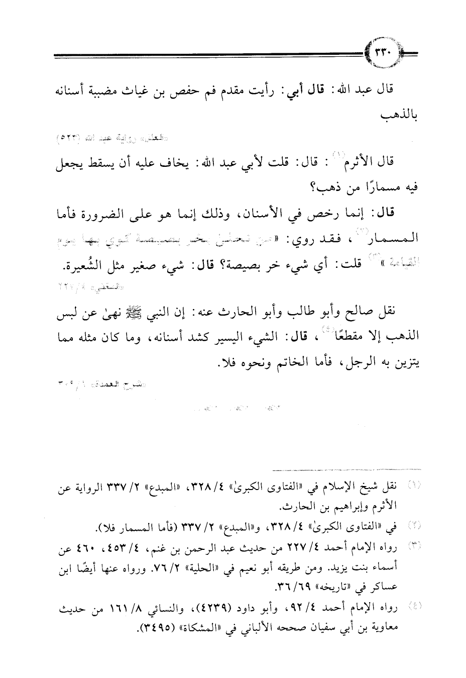 نقل صالح وأبو طالب وأبو الحارث عنه: إن النبي -صلى اللَّه عليه وسلم- نهى عن لبس الذهب إلا مقطعًا (¬4)، قال: الشيء اليسير كشد أسنانه، وما كان مثله مما يتزين به الرجل، فأما الخاتم ونحوه فلا.
