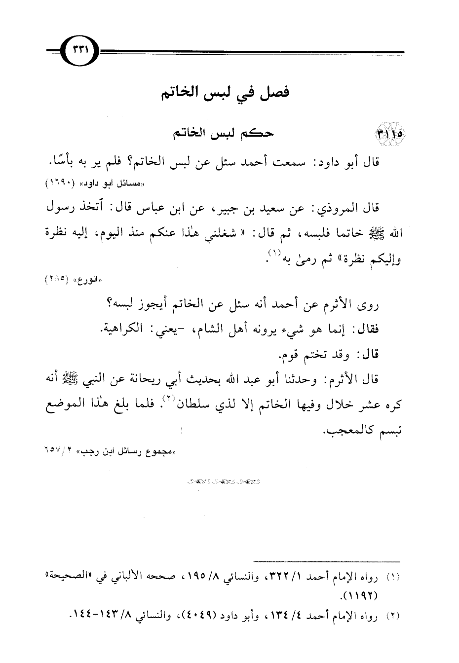 قال الأثرم: وحدثنا أبو عبد اللَّه بحديث أبي ريحانة عن النبي -صلى اللَّه عليه وسلم- أنه كره عشر خلال وفيها الخاتم إلا لذي سلطان (¬2). فلما بلغ هذا الموضع تبسم كالمعجب.