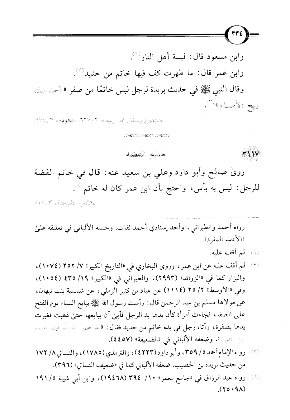 (¬2) لم أقف عليه عن ابن عمر، وروى البخاري في "التاريخ الكبير" 7/ 252 (1074)، والبزار كما في "الزوائد" (2993)، والطبراني في "الكبير" 19/ 435 (1054)، وفي "الأوسط" 2/ 25 (1114) عن عباد بن كثير الرملي، عن شمسية بنت نبهان، عن مولاها مسلم بن عبد الرحمن قال: رأست رسول اللَّه -صلى اللَّه عليه وسلم- يبايع النساء يوم الفتح على الصفا، فجاءت امرأة كأن يدها يد الرجل فأبى أن يبايعها حتى ذهبت فغيرت يدها بصفرة، وأتاه رجل في يده خاتم من حديد فقال: "ما ظهر اللَّه كفًا فيها خاتم من حديد". وضعفه الألباني في "الضعيفة" (4457).