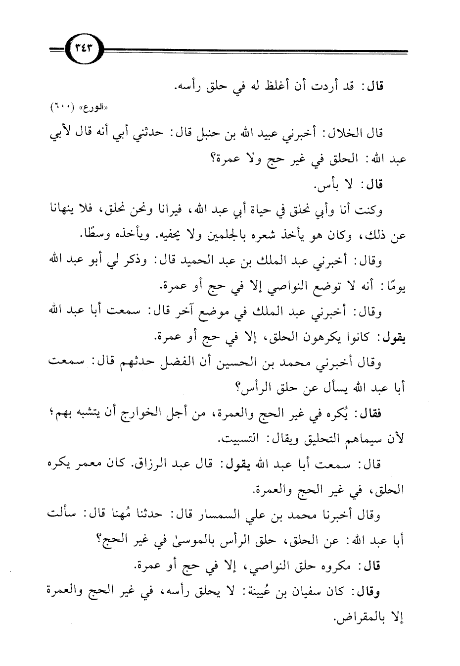 قال الخلال: أخبرني عبيد اللَّه بن حنبل قال: حدثني أبي أنه قال لأبي عبد اللَّه: الحلق في غير حج ولا عمرة؟