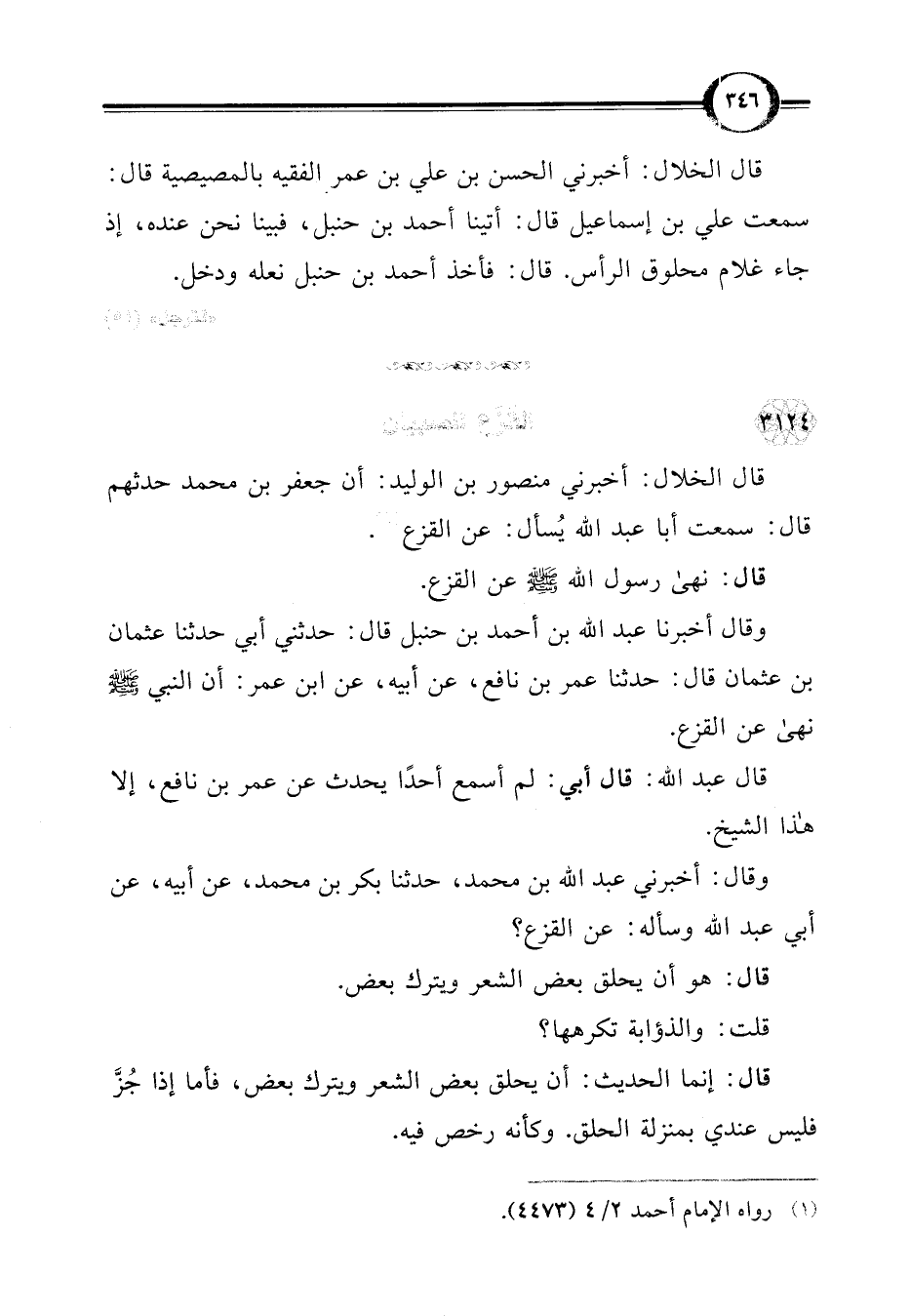 قال الخلال: أخبرني منصور بن الوليد: أن جعفر بن محمد حدثهم قال: سمعت أبا عبد اللَّه يُسأل: عن القزع (¬1).