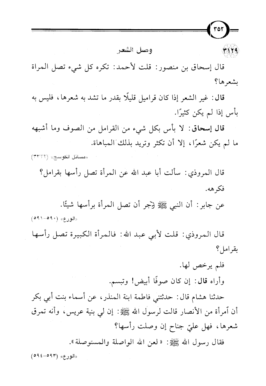 قال المروذي: قلت لأبي عبد اللَّه: فالمرأة الكبيرة تصل رأسها بقرامل؟