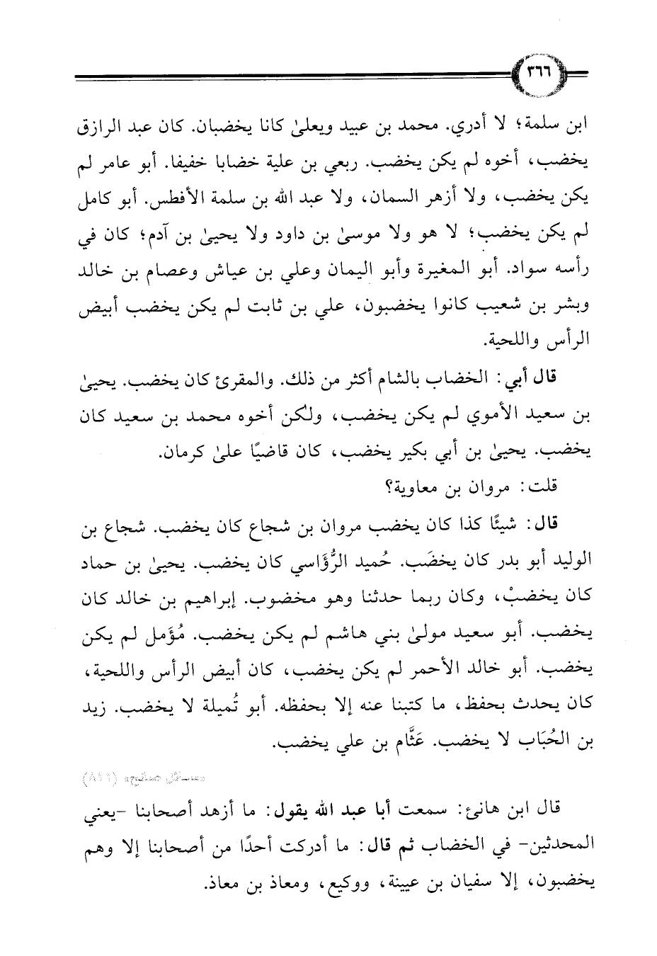 ابن سلمة؛ لا أدري. محمد بن عبيد ويعلى كانا يخضبان. كان عبد الرازق يخضب، أخوه لم يكن يخضب. ربعي بن علية خضابا خفيفا. أبو عامر لم يكن يخضب، ولا أزهر السمان، ولا عبد اللَّه بن سلمة الأفطس. أبو كامل لم يكن يخضب؛ لا هو ولا موسى بن داود ولا يحيى بن آدم؛ كان في رأسه سواد. أبو المغيرة وأبو اليمان وعلي بن عياش وعصام بن خالد وبشر بن شعيب كانوا يخضبون، علي بن ثابت لم يكن يخضب أبيض الرأس واللحية.