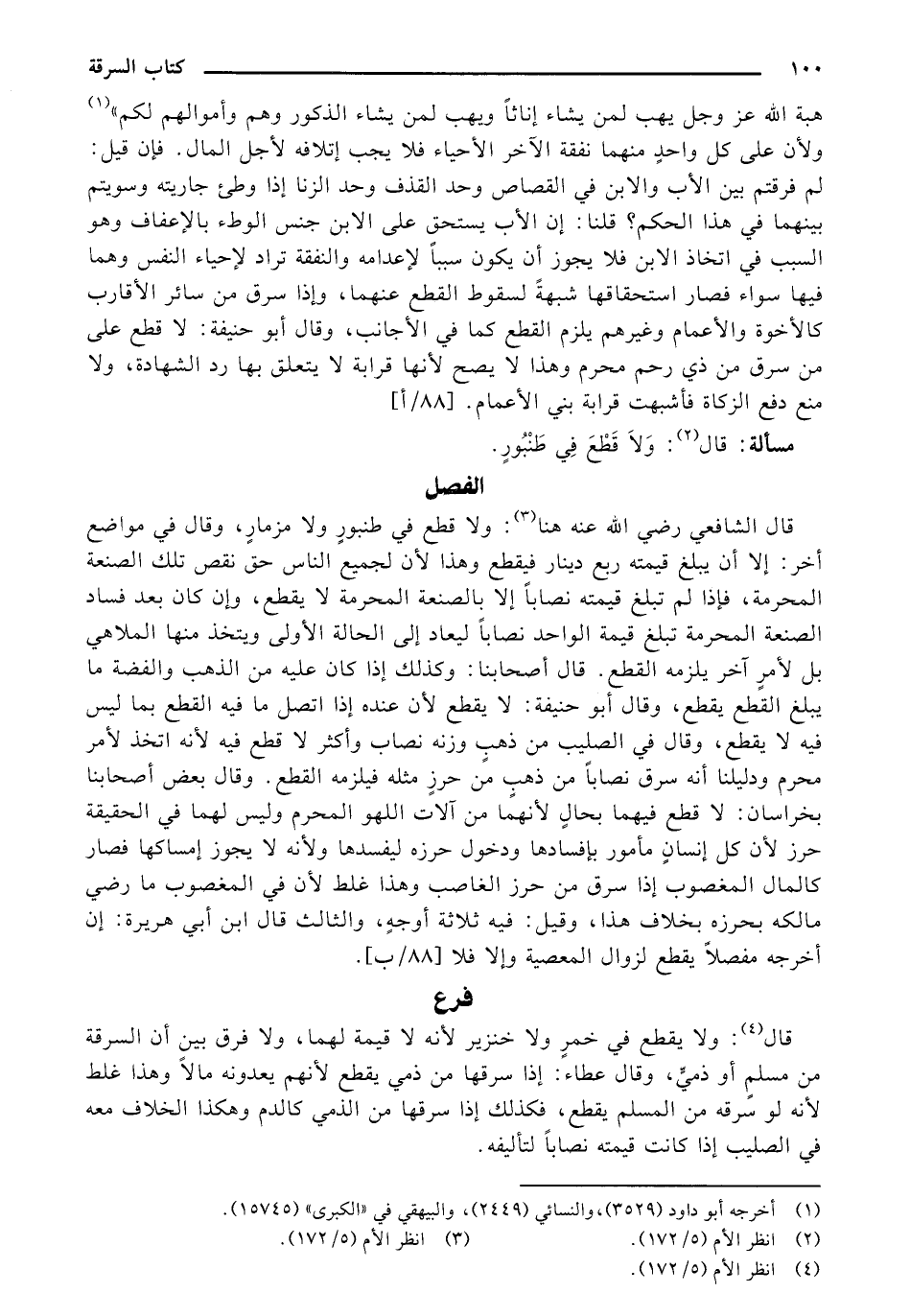 هبة الله عز وجل يهب لمن يشاء إناثًا ويهب لمن يشاء الذكور وهم وأموالهم لكم" ولأن على كل واحدٍ منهما نفقة الآخر الأحياء فلا يجب إتلافه لأجل المال. فإن قيل: لم فرقتم بين الأب والابن في القصاص وحد القذف وحد الزنا إذا وطئ جاريته وسويتم بينهما في هذا الحكم؟ قلنا: إن الأب يستحق على الابن جنس الوطء بالإعفاف وهو السبب في اتخاذ الابن فلا يجوز أن يكون سببًا لإعدامه والنفقة تراد لإحياء النفس وهما فيها سواء فصار استحقاقها شبهة لسقوط القطع عنهما، وإذا سرق من سائر الأقارب كالأخوة والأعمام وغيرهم يلزم القطع كما في الأجانب، وقال أبو حنيفة: لا قطع على من سرق من ذي رحم محرم وهذا لا يصح لأنها قرابة لا يتعلق بها رد الشهادة، ولا منع دفع الزكاة فأشبهت قرابة بني الأعمام. [88/أ]