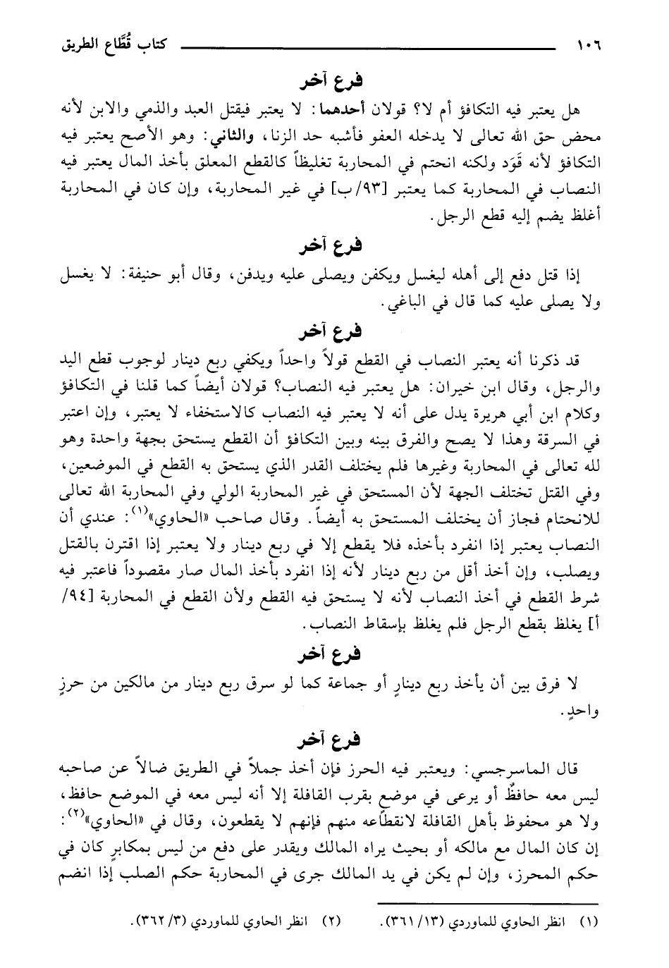 هل يعتبر فيه التكافؤ أم لا؟ قولان أحدهما: لا يعتبر فيقتل العبد والذمي والابن لأنه محض حق الله تعالى لا يدخله العفو فأشبه حد الزنا، والثاني: وهو الأصح يعتبر فيه التكافؤ لأنه قَوَد ولكنه انحتم في المحاربة تغليظًا في المحاربة تغليظًا كالقطع المعلق بأخذ المال يعتبر فيه النصاب في المحاربة كما يعتبر [93/ب] في غير المحاربة، وإن كان في المحاربة أغلظ يضم إليه قطع الرجل.