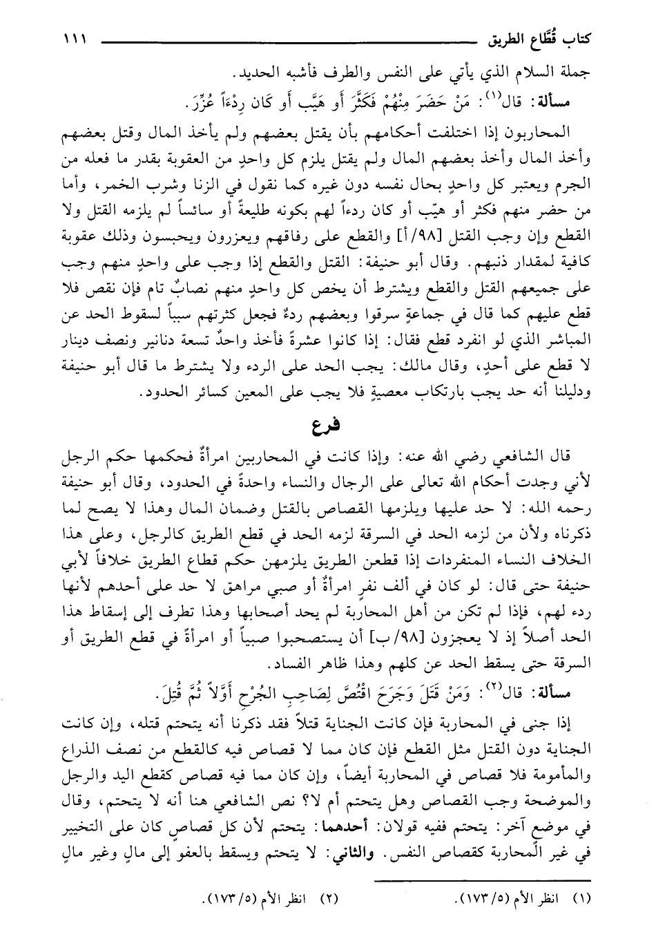 قال الشافعي رضي الله عنه: وإذا كانت في المحاربين امرأة فحكمها حكم الرجل لأني وجدت أحكام الله تعالى على الرجال والنساء واحدةٌ في الحدود، وقال أبو حنيفة رحمه الله: لا حد عليها ويلزمها القصاص بالقتل وضمان المال وهذا لا يصح لما ذكرناه ولأن من لزمه الحد في السرقة لزمه الحد في قطع الطريق كالرجل، وعلى هذا الخلاف النساء المنفردات إذا قطعت الطريق يلزمهن حكم قطاع الطريق خلافًا لأبي حنيفة حتى قال: لو كان في ألف نفرٍ امرأةٌ أو صبي مراهق لا حد على أحدهم لأنها ردء لهم، فإذا لم تكن من أهل المحاربة لم يحد أصحابها وهذا تطرف إلى إسقاط هذا الحد أصلًا إذ لا يعجزون [98/ب] أن يستصحبوا صبيًا أو امرأةً في قطع الطريق أو السرقة حتى يسقط الحد عن كلهم وهذا ظاهر الفساد.