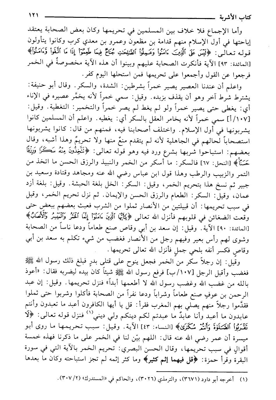 واعلم أن عندنا العصير يصير خمرًا بشرطين: الشدة، والسكر، وقال أبو حنيفة: يشترط شرط آخر وهو أن يقذف بزبده، وقيل: سمي خمرًا لأنه يخمر عصيره في الإناء أي: يغطى حتى يصير خمرًا ولو لم يغط لم يصر خمرًا والتخمير: التغطية، وقيل: [107/ أ] سمي خمرًا لأنه يخامر العقل بالسكر أي: يغطيه، واعلم أن المسلمين كانوا يشربونها في أول الإسلام، واختلف أصحابنا فيه، فمنهم من قال: كانوا يشربونها استصحابًا لحالهم في الجاهلية لأنه لم يتقدم منع منها ولا تحرم وهذا أشبه، وقال بعضهم: استباحوا شربها بشرع ورد فيه وهو قوله تعالى: {تَتَّخِذُونَ مِنْهُ سَكَرًا وَرِزْقًا حَسَنًا} [النحل: 67] فالسكر: ما أسكر من الخمر والنبيذ والرزق الحسن ما اتخذ من التمر والزبيب والرطب وهذا قول ابن عباس رضي الله عنه ومجاهد وقتادة وسعيد بن جبير ثم نسخ هذا بتحريم الخمر، وقيل: السكر: الخل بلغة الحبشة، وقيل: بلغة أزد عمان، وقيل: السكر: الطعام والرزق الحسن والإيمان. ثم نزل تحريم الخمر، وقيل في سبب تحريمها: أن قبيلتين من الأنصار ثملوا من الشرب فعبث بعضهم ببعض حتى وقعت الضغائن في قلوبهم فأنزل الله تعالى: {يَا أَيُّهَا الَّذِينَ آمَنُوا إِنَّمَا الْخَمْرُ وَالْمَيْسِرُ وَالأَنْصَابُ وَالأَزْلامُ} [المائدة: 90] الآية، وقيل: إن سعد بن أبي وقاص صنع طعامًا ودعا ناسًا من الصحابة وشوى لهم رأس بعير وفيهم رجل من الأنصار فعضب من شيء تكلم به سعد بن أبي وقاص فكسر أنفه بلحي جمل فأنزل الله تعالى تحريمها.